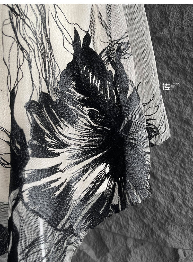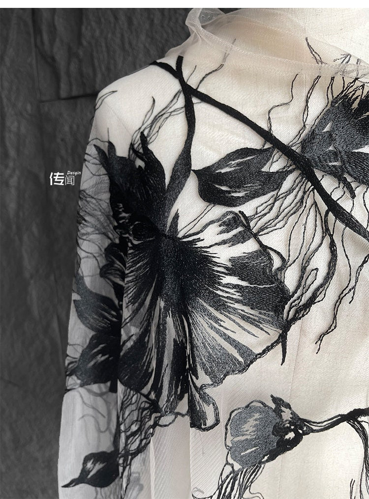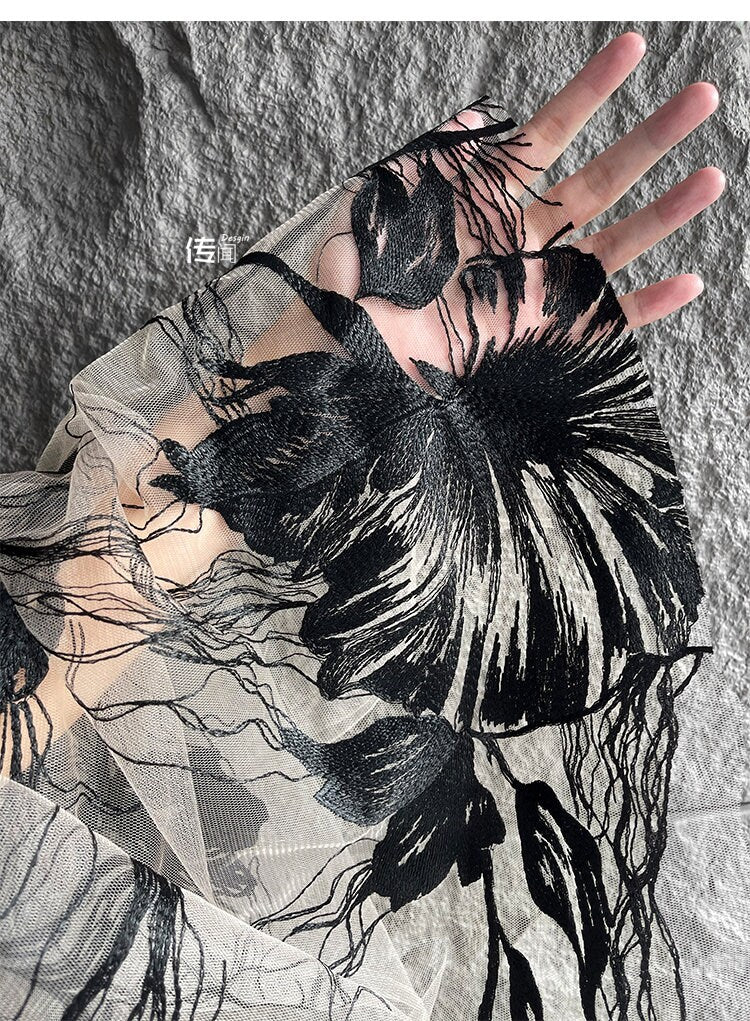 Black 3D Flower Embroidery Lace Fabric - Bridal Wedding Dress, Costume - 57"W
