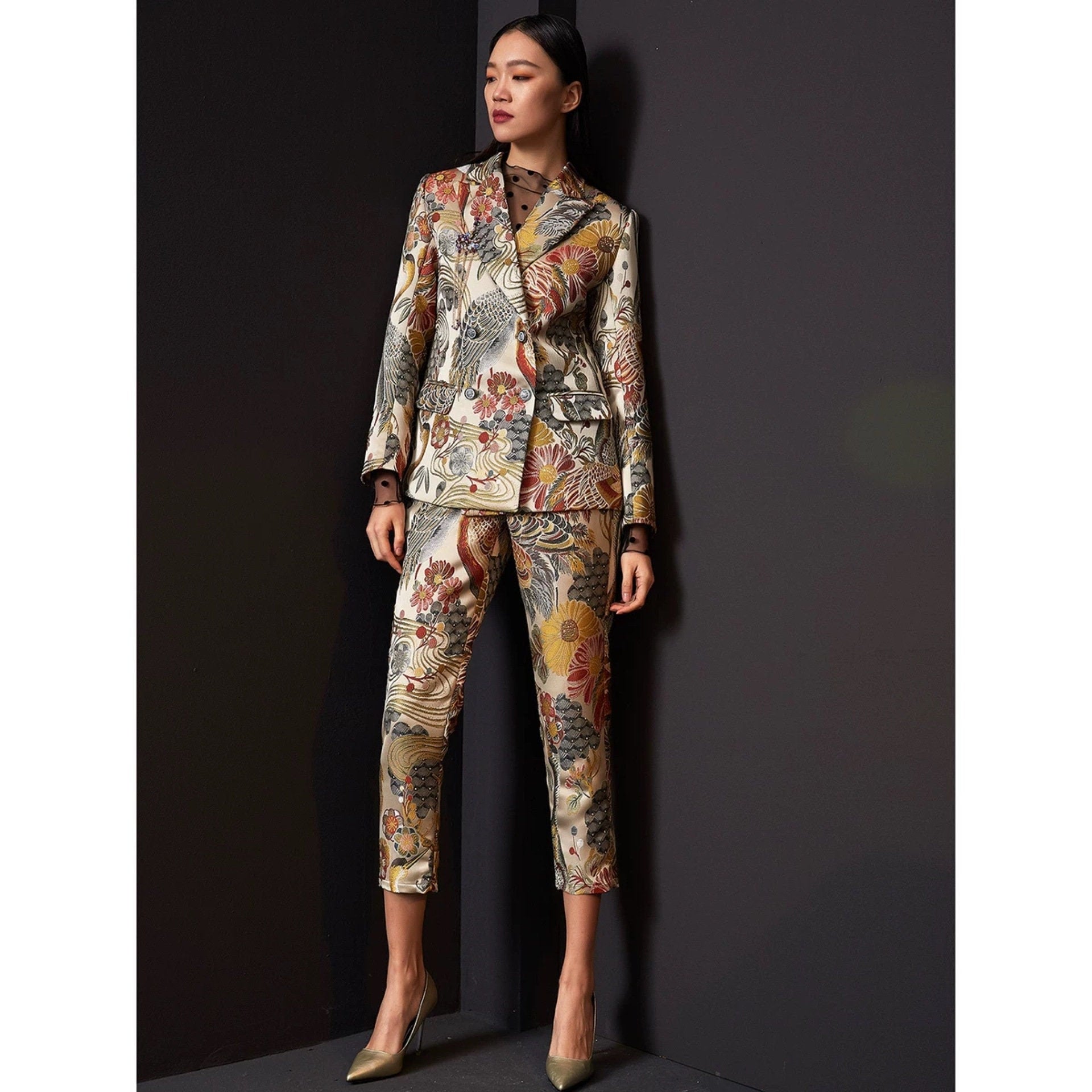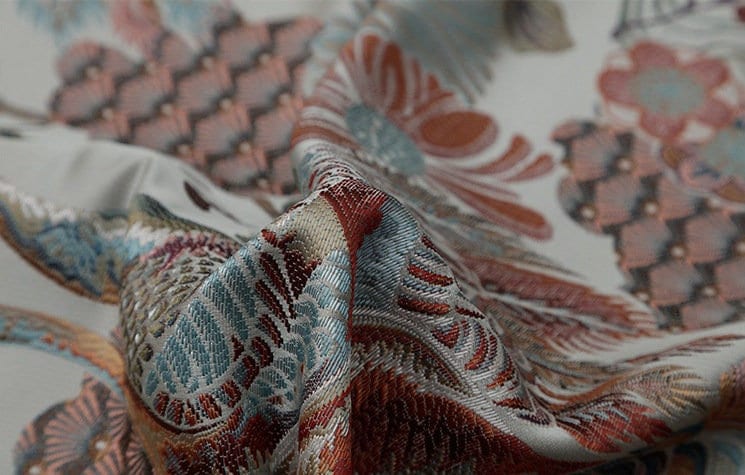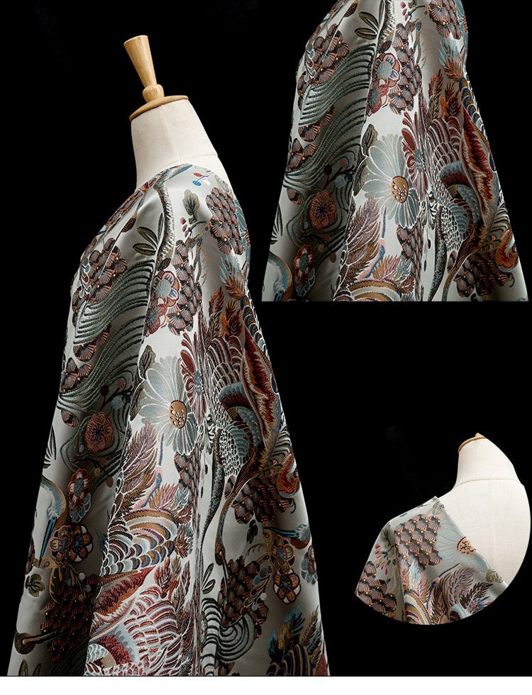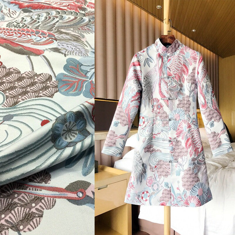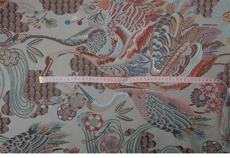 Crane & Flower Jacquard Fabric: Vintage Embroidery Style, 57" Wide
