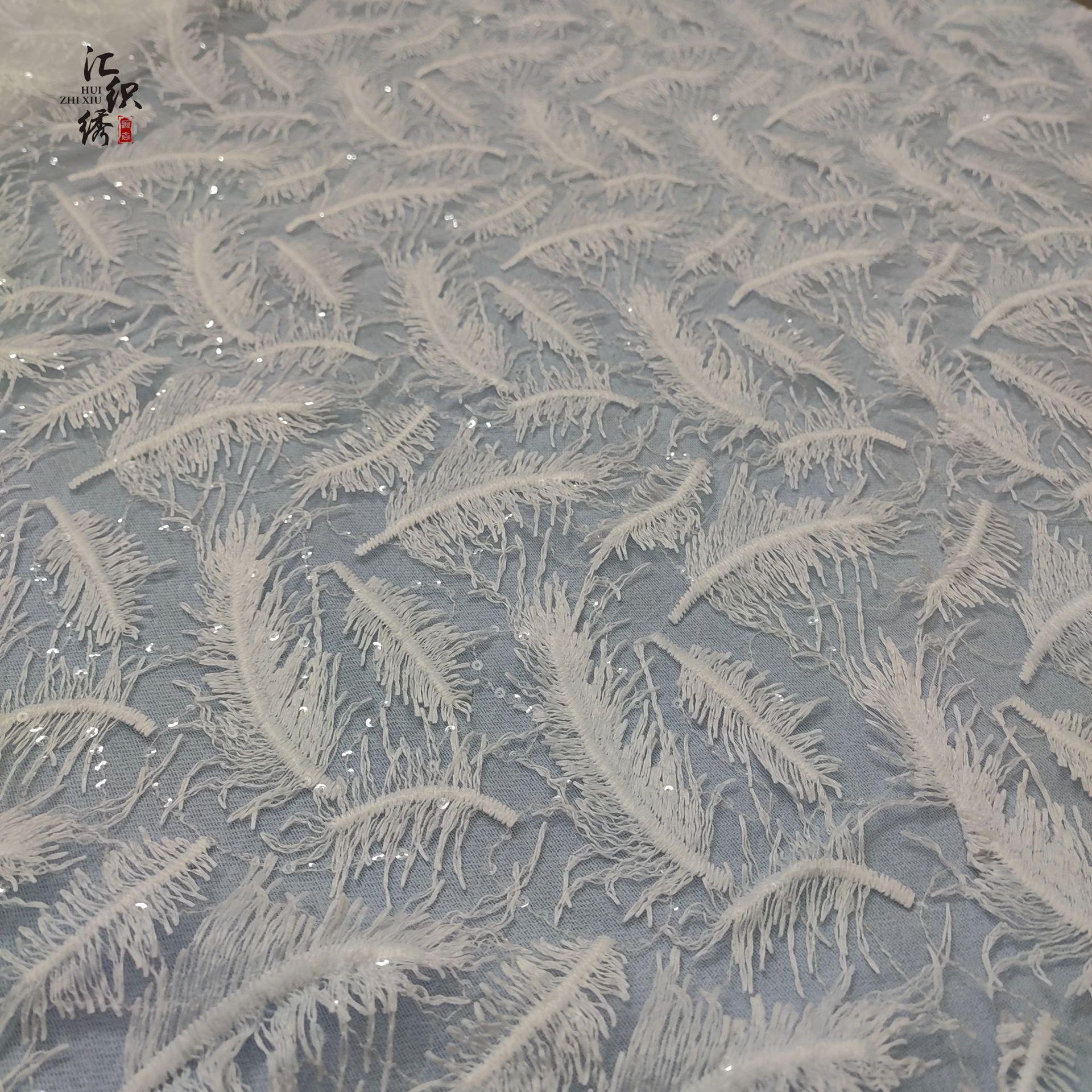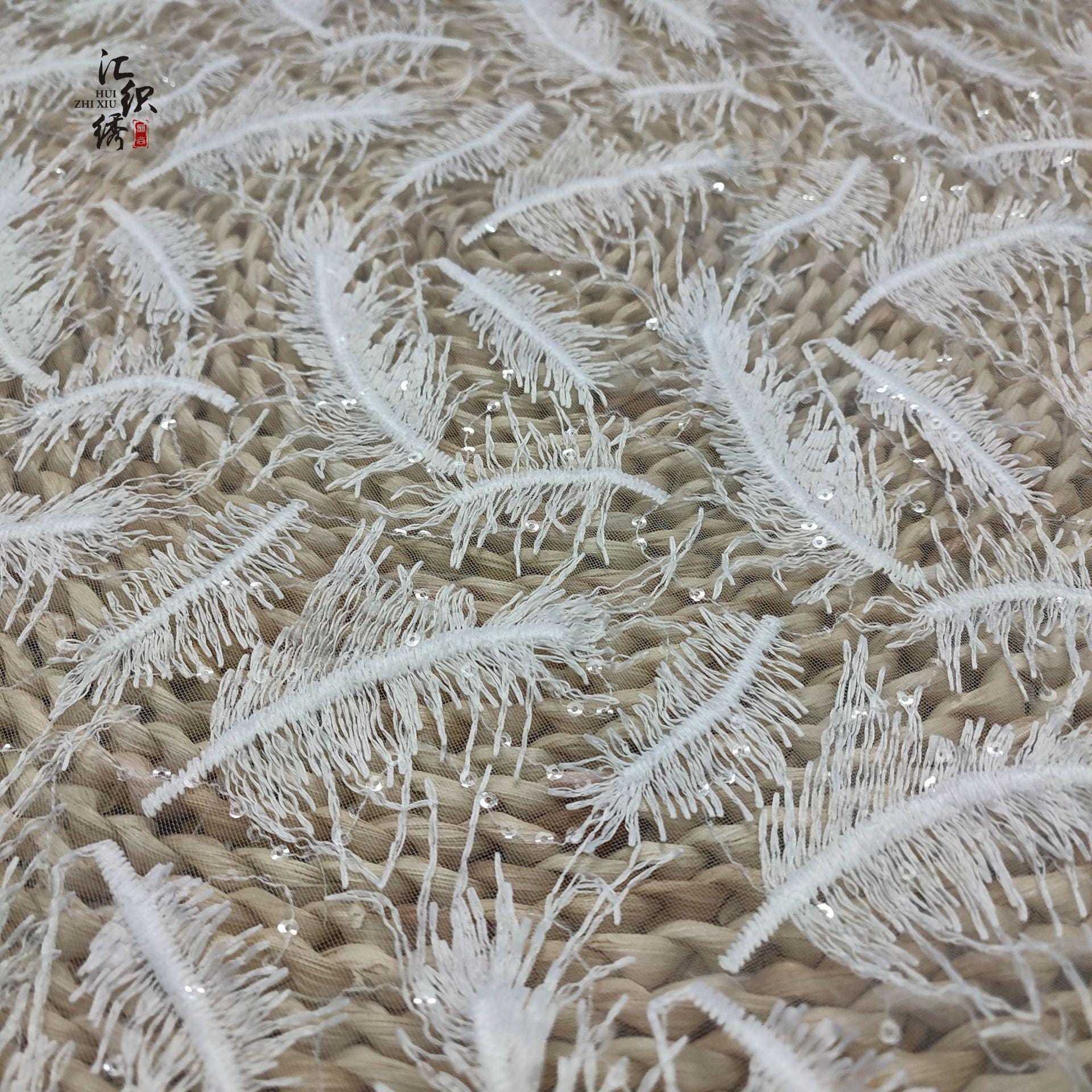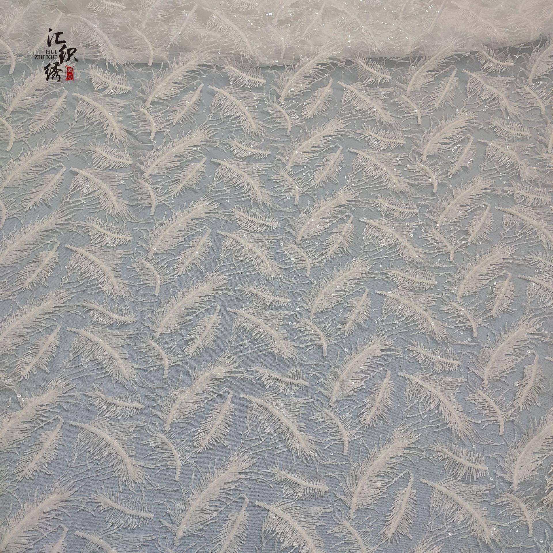 Feather Embroidery Lace Fabric: 3D Sequin Floral Applique, 50"W