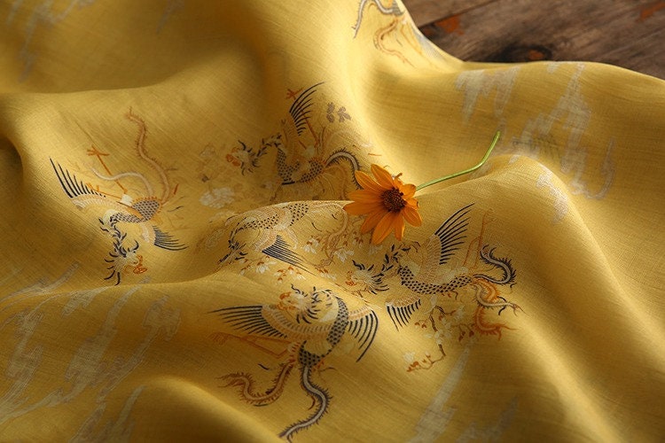 Yellow Dragon Phoenix Print Ramie Fabric: 57" Wide