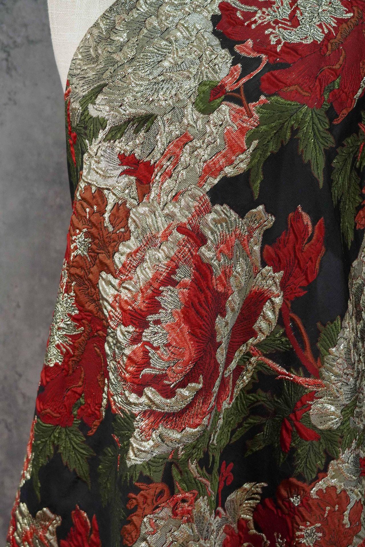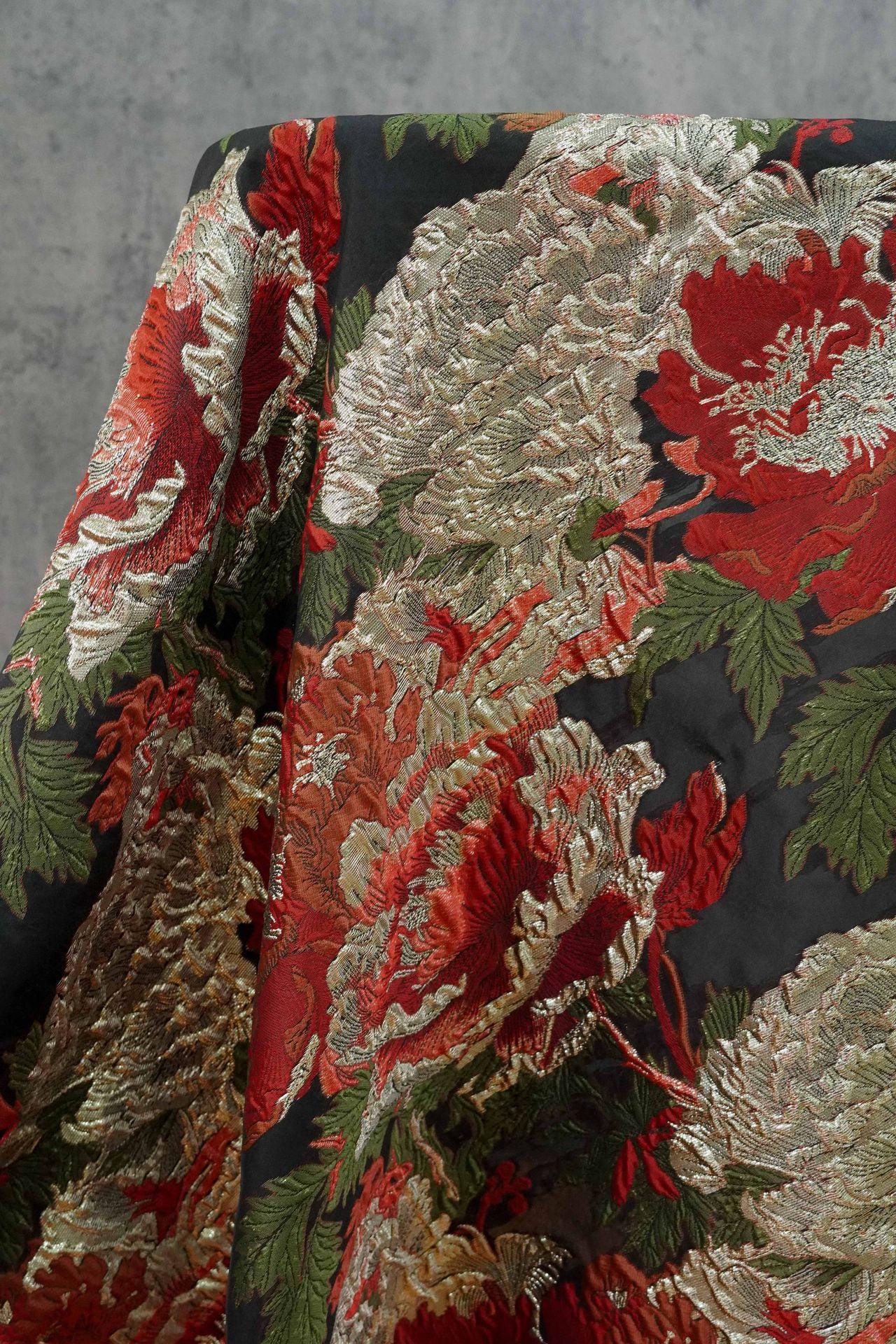 Tissu brocart pivoine 3D avec fils d'or : Jacquard vintage, 142 cm de large