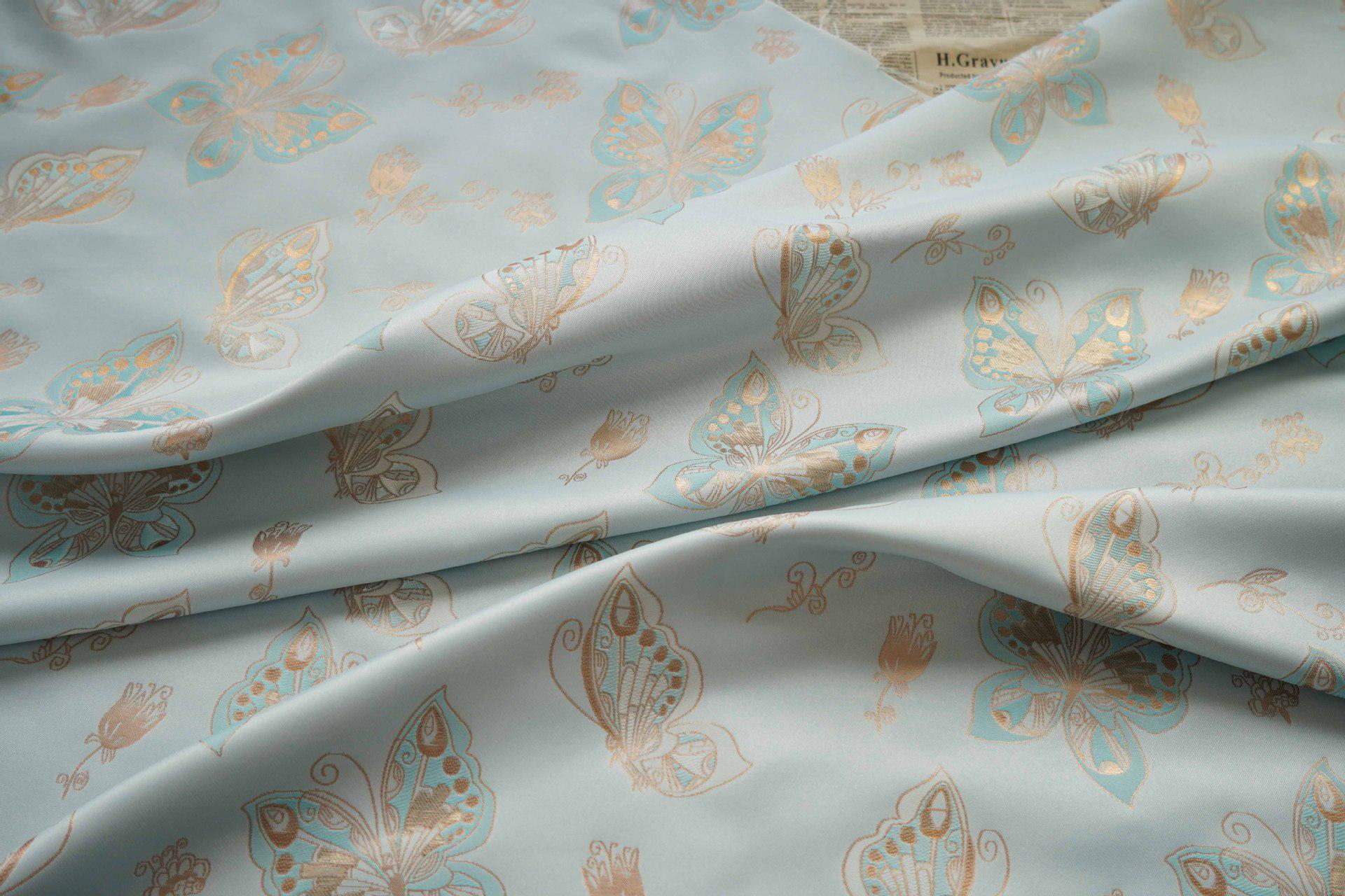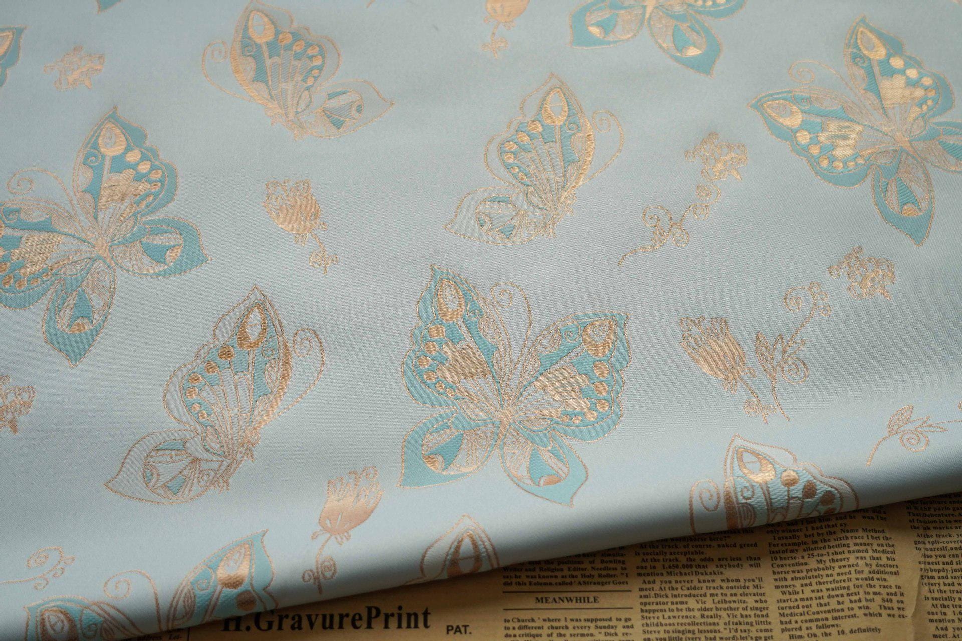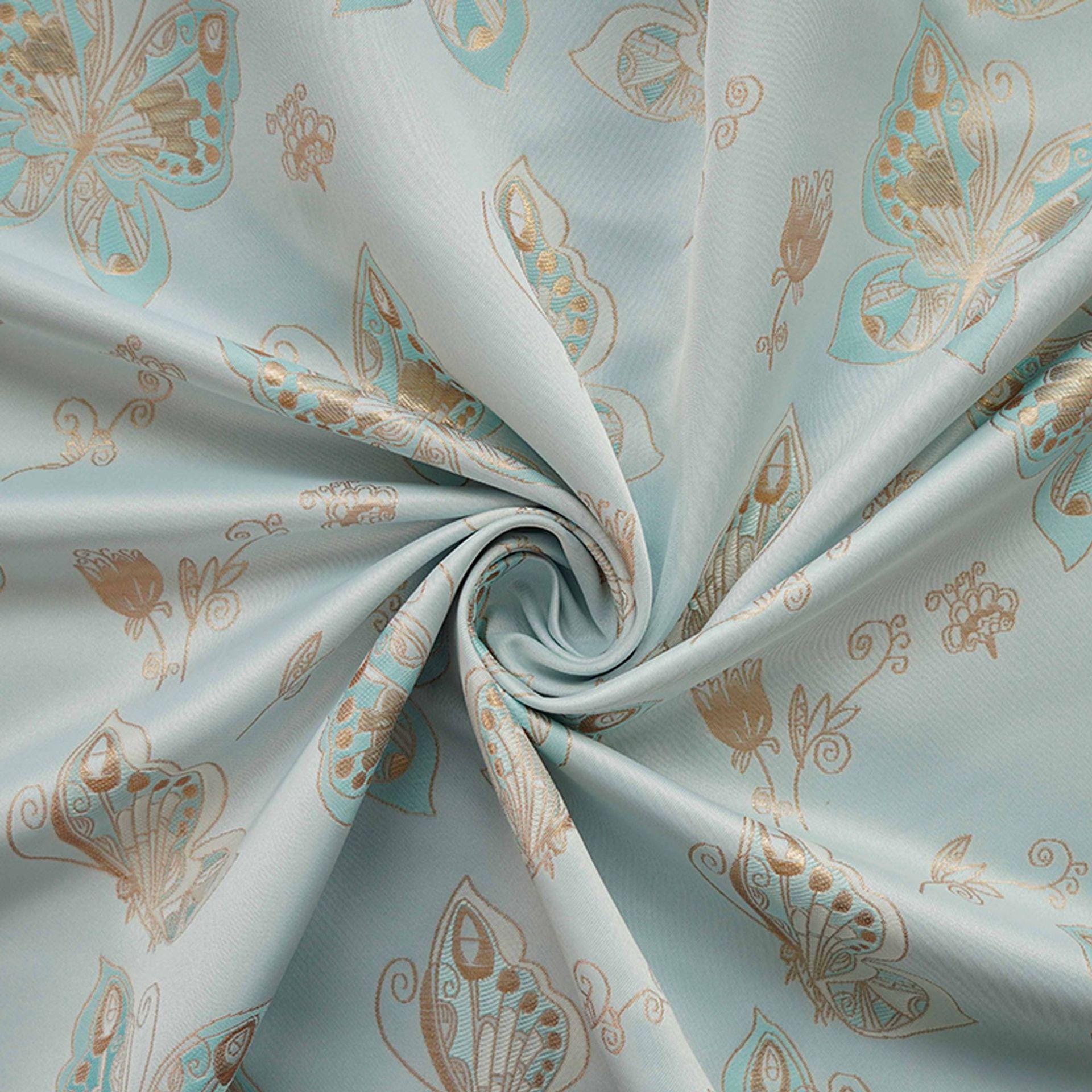 Tissu jacquard à motif papillons et feuille d'or Aqua : chenille pour ameublement, 142 cm de large