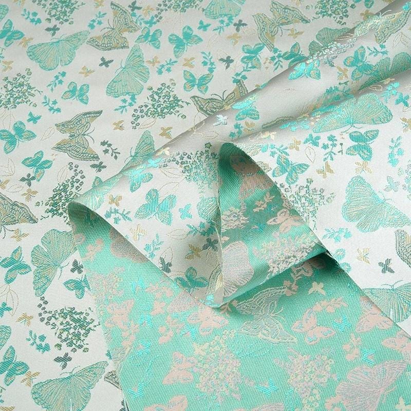 Tissu brocart de soie vert turquoise : jacquard à motifs floraux papillons, 147 cm de large