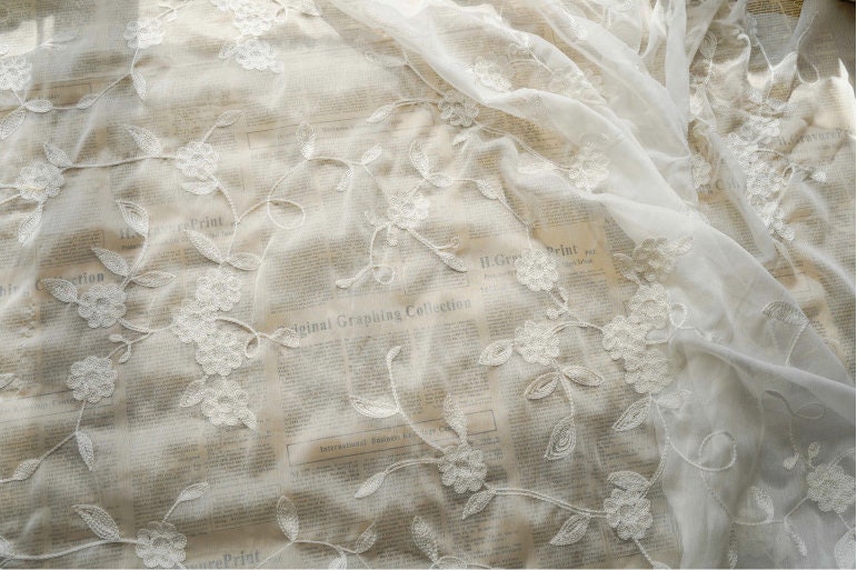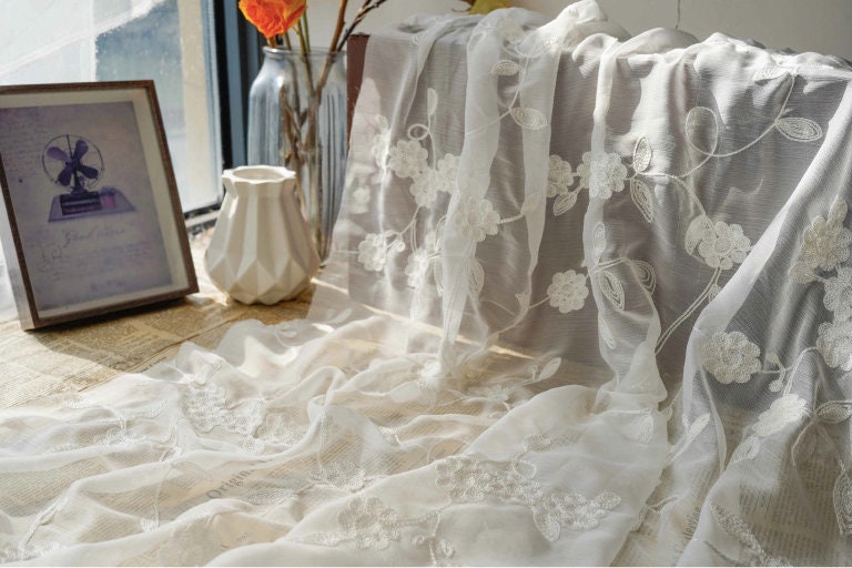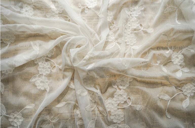 Tissu mousseline brodé de fleurs blanches : matière pour robe en soie 3D