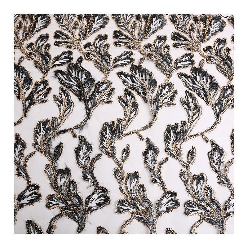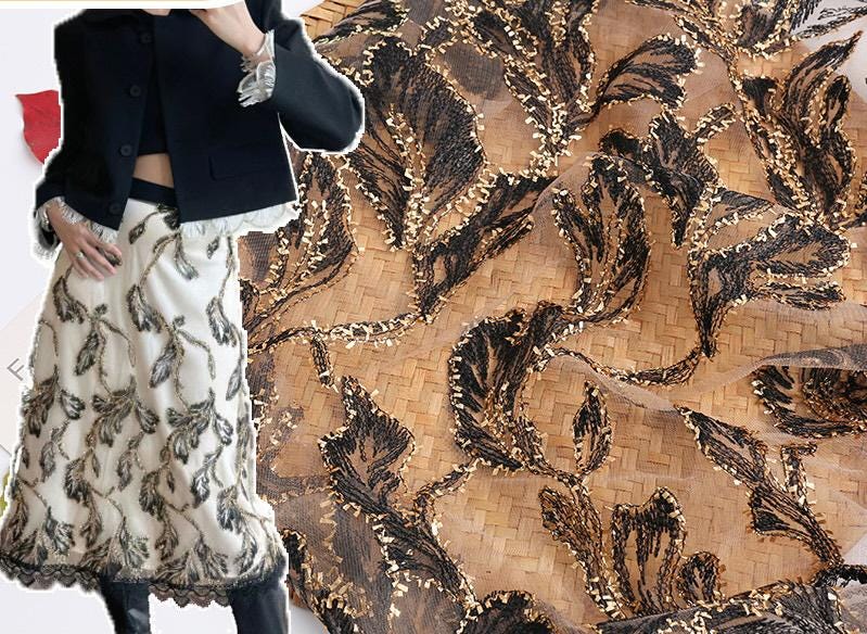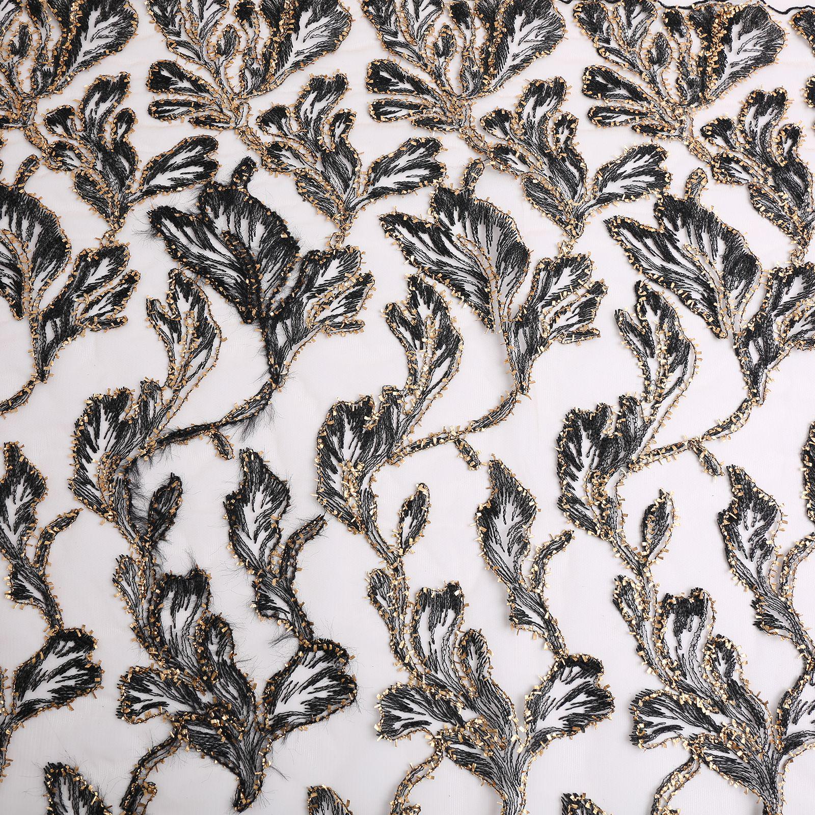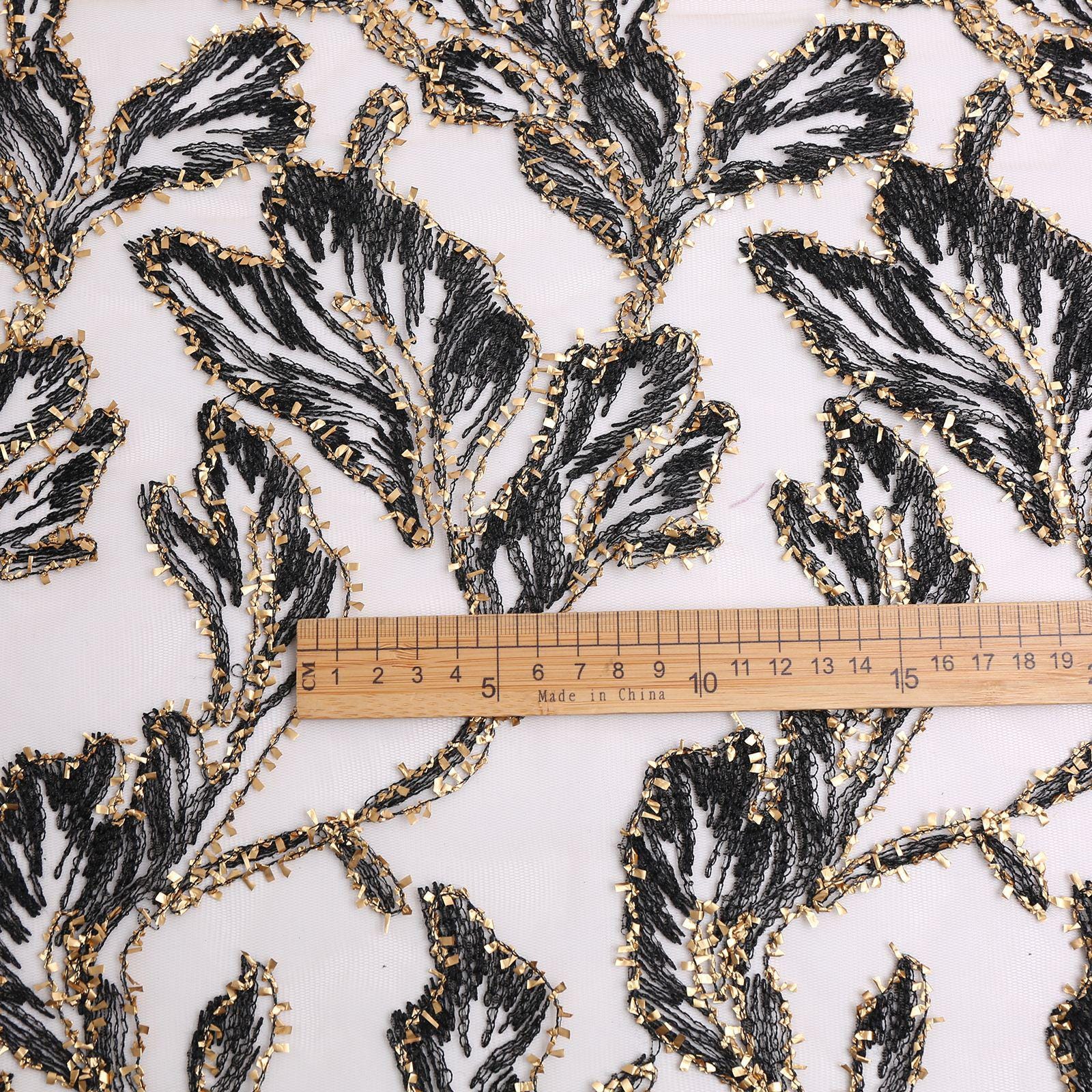 Foil Leaf Sequin Embroidery Fabric: Black & Gold Floral, 50"W