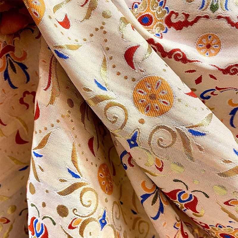 Tibetan Brocade Fabric: Buddhist Lotus Embroidery, 59"W Rayon Blend