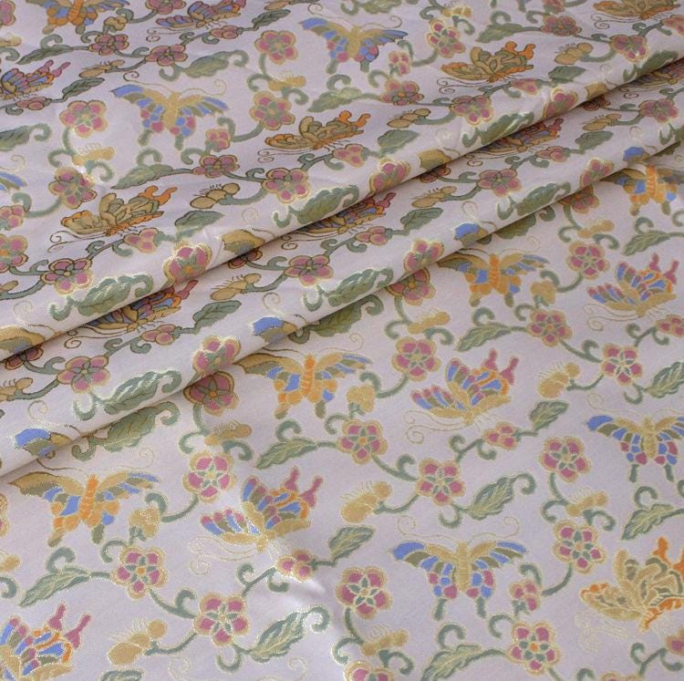Tibetan Brocade Fabric: Butterfly & Lotus Embroidery, 28" Wide