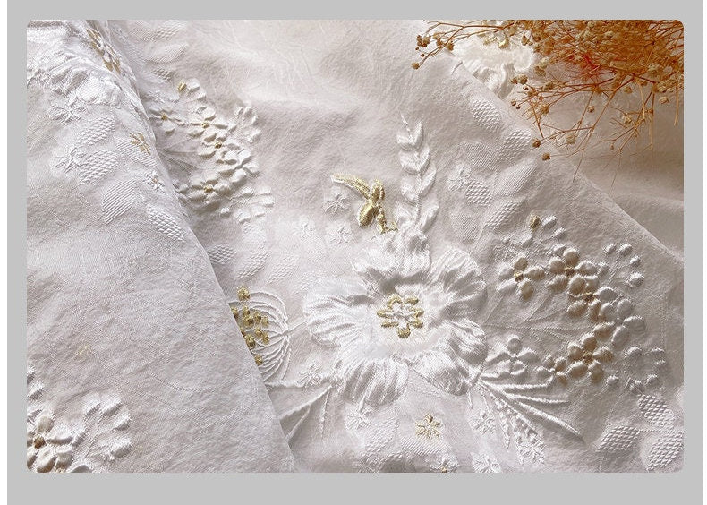 White Dandelion Jacquard Fabric: 3D Gold Lurex Woven Embossed, 57" Wide