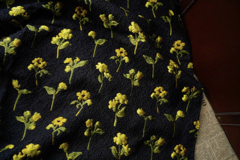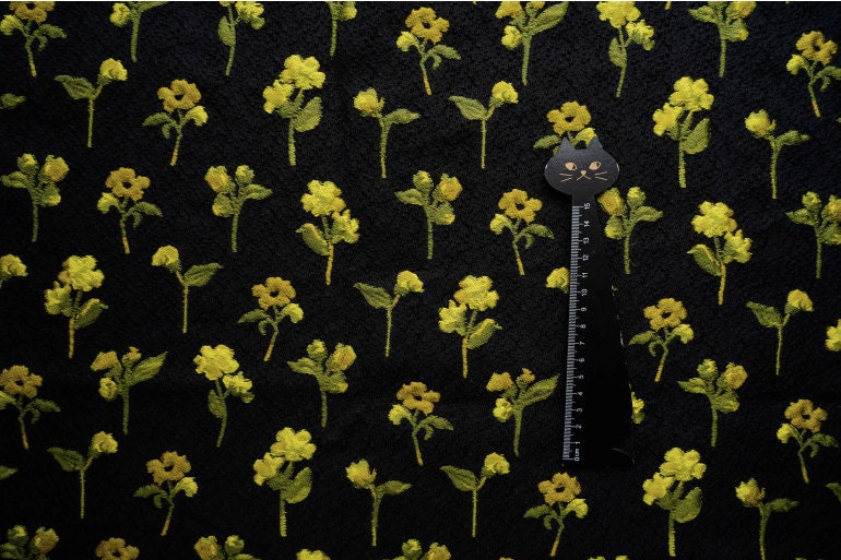 Yellow Flower Jacquard Fabric, Black 3D Designer Fabric, 55"W
