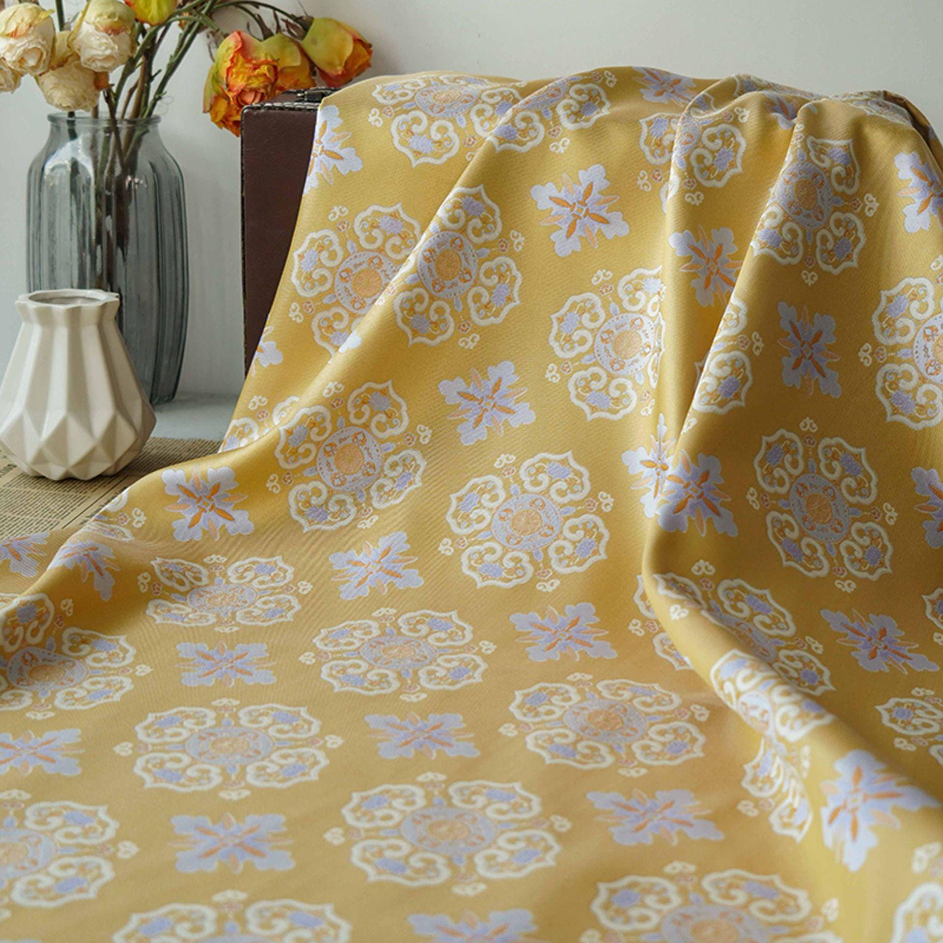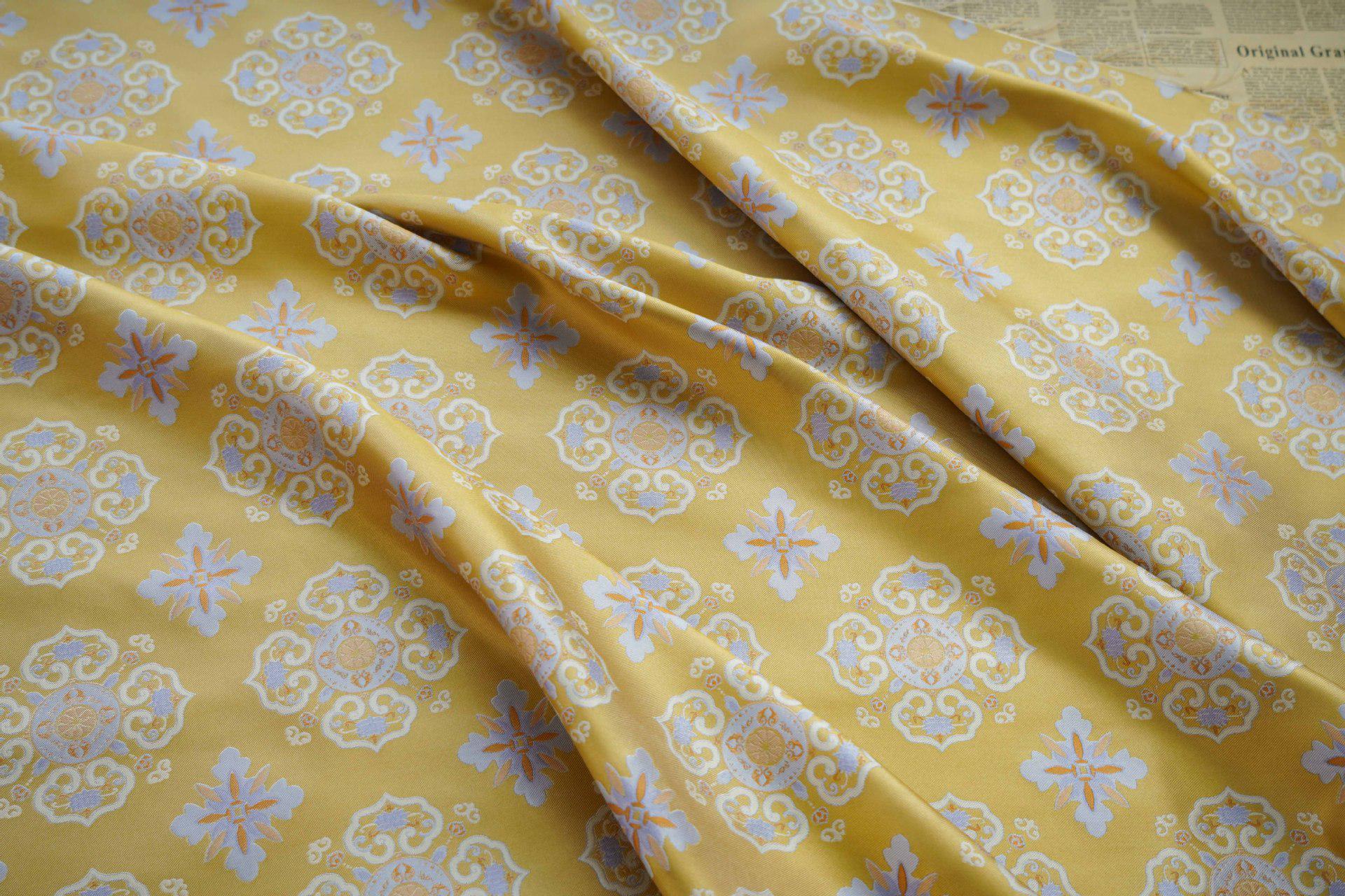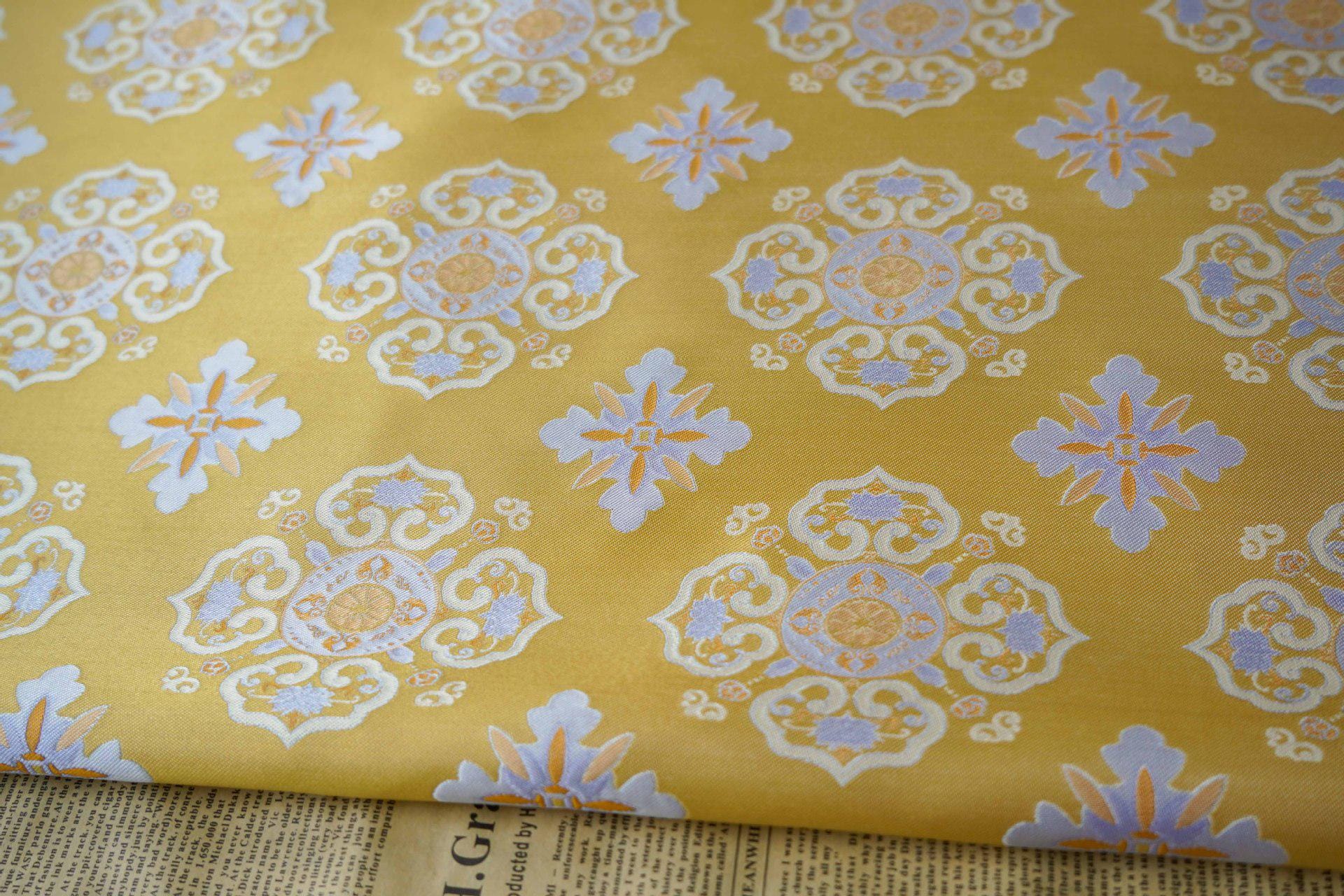 Yellow Silk Brocade Fabric: Chinese Floral Pattern, 59" Wide