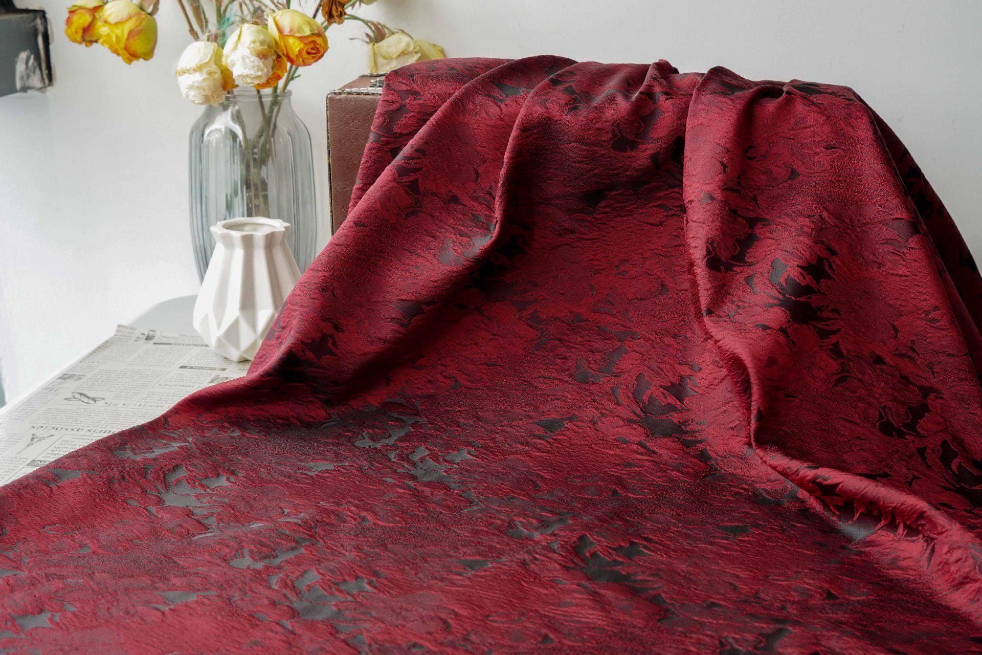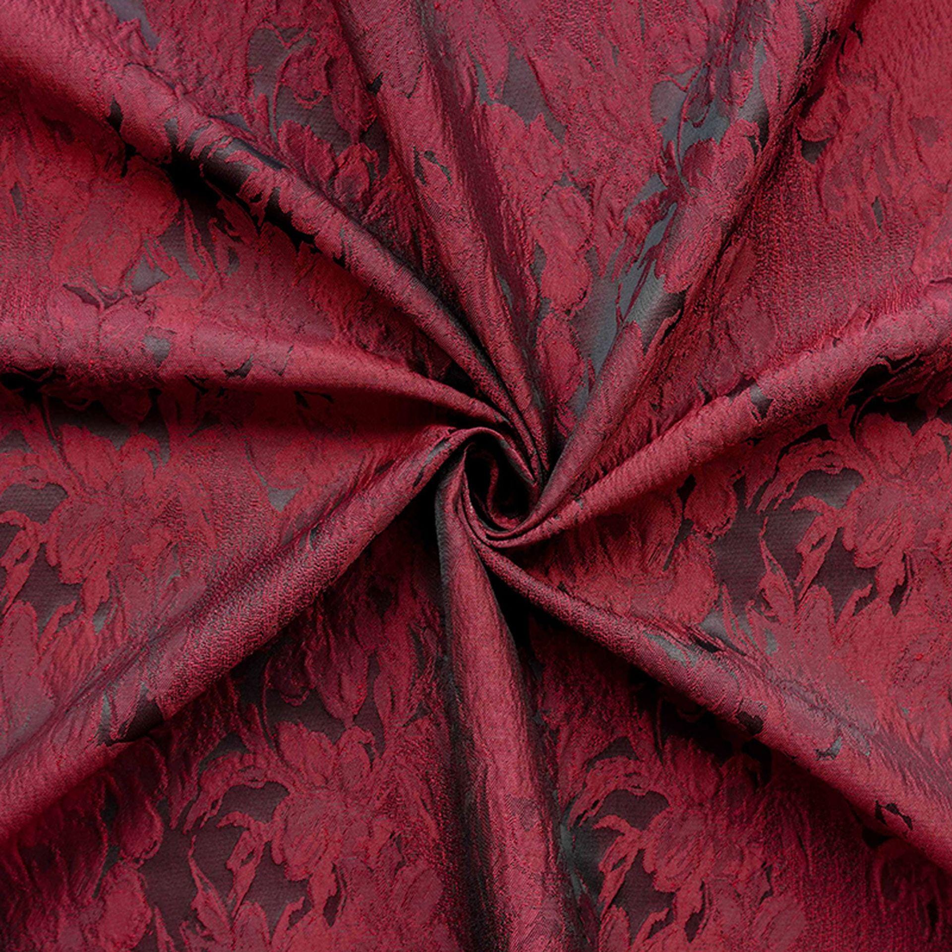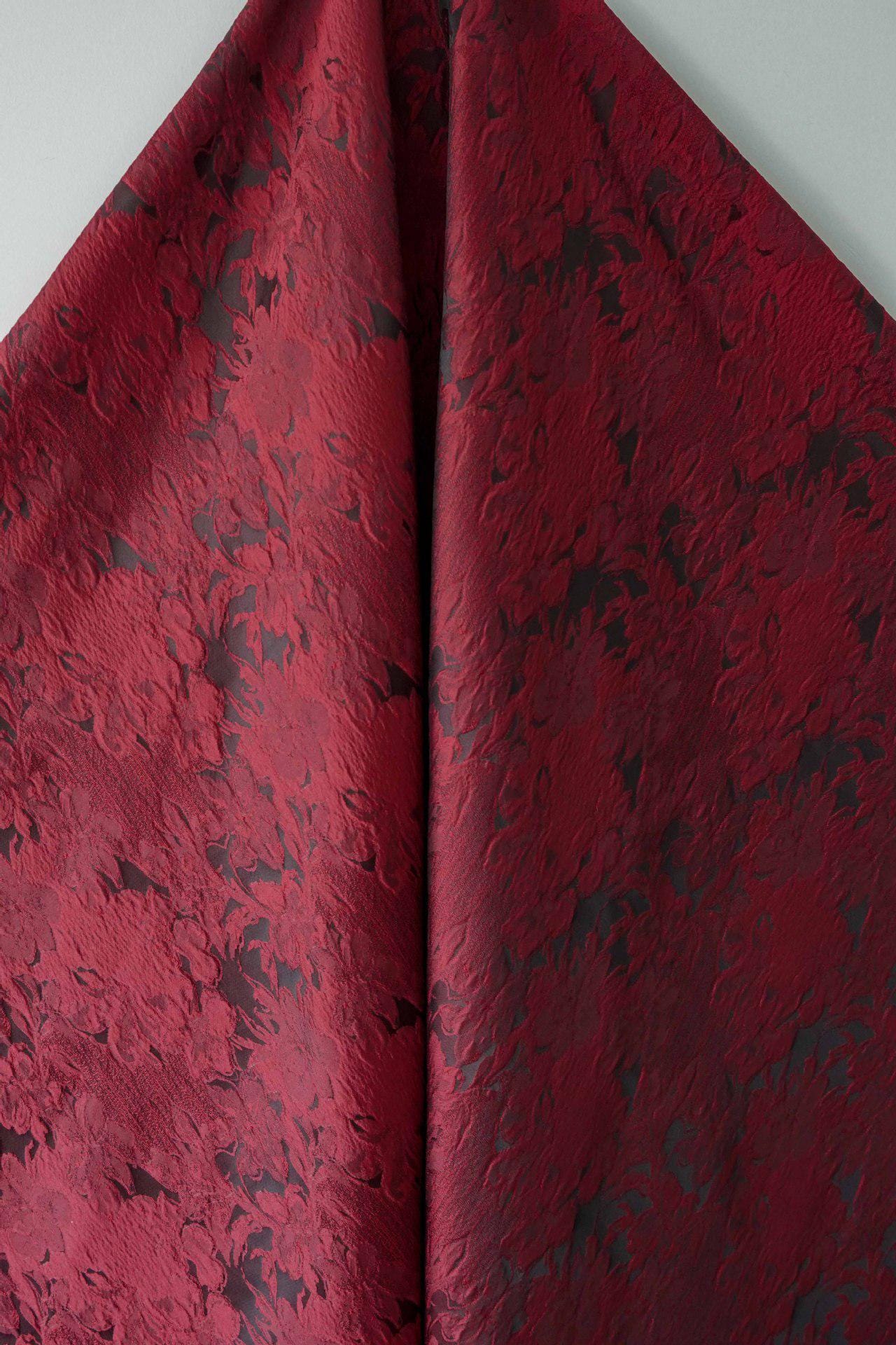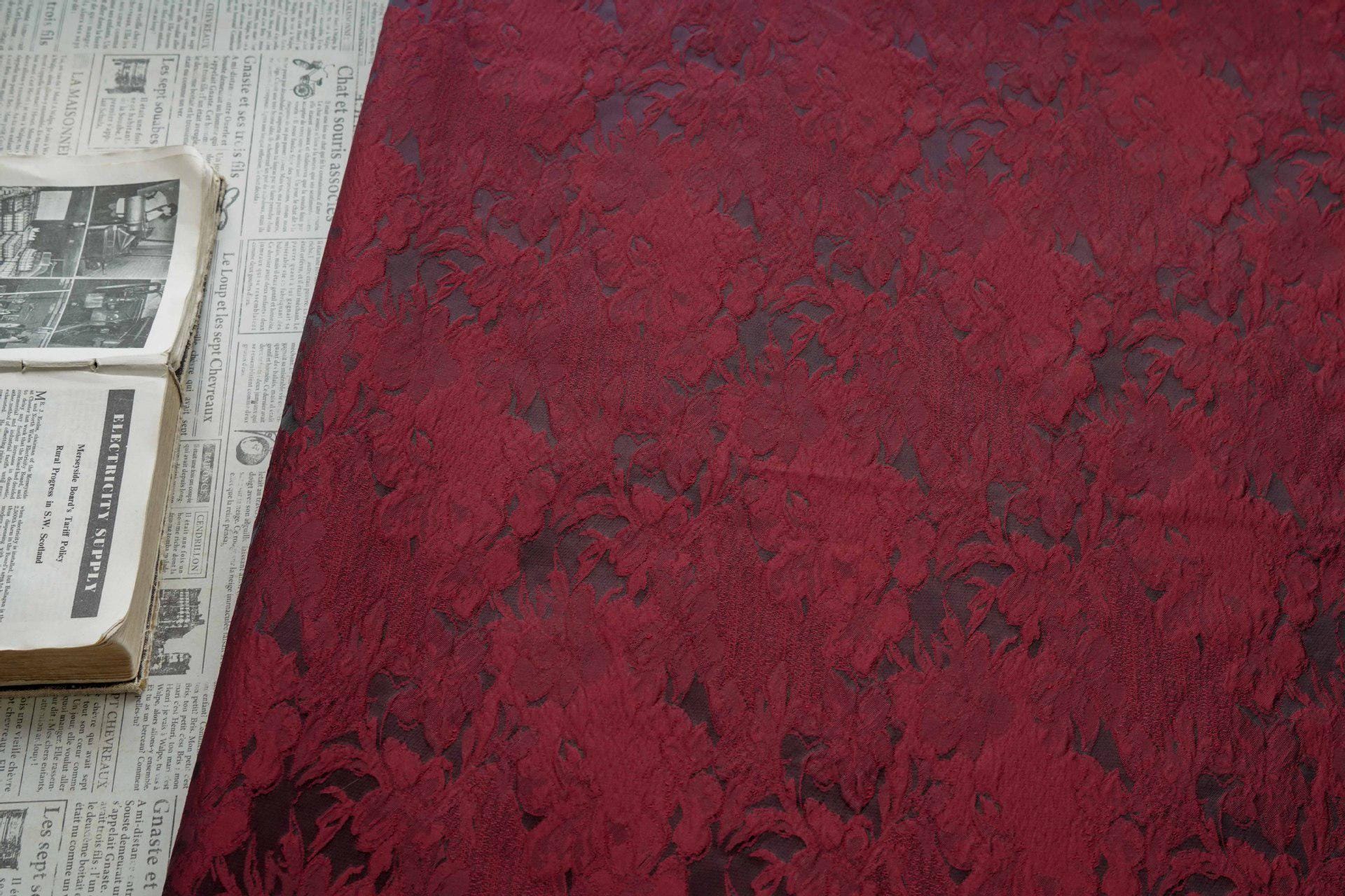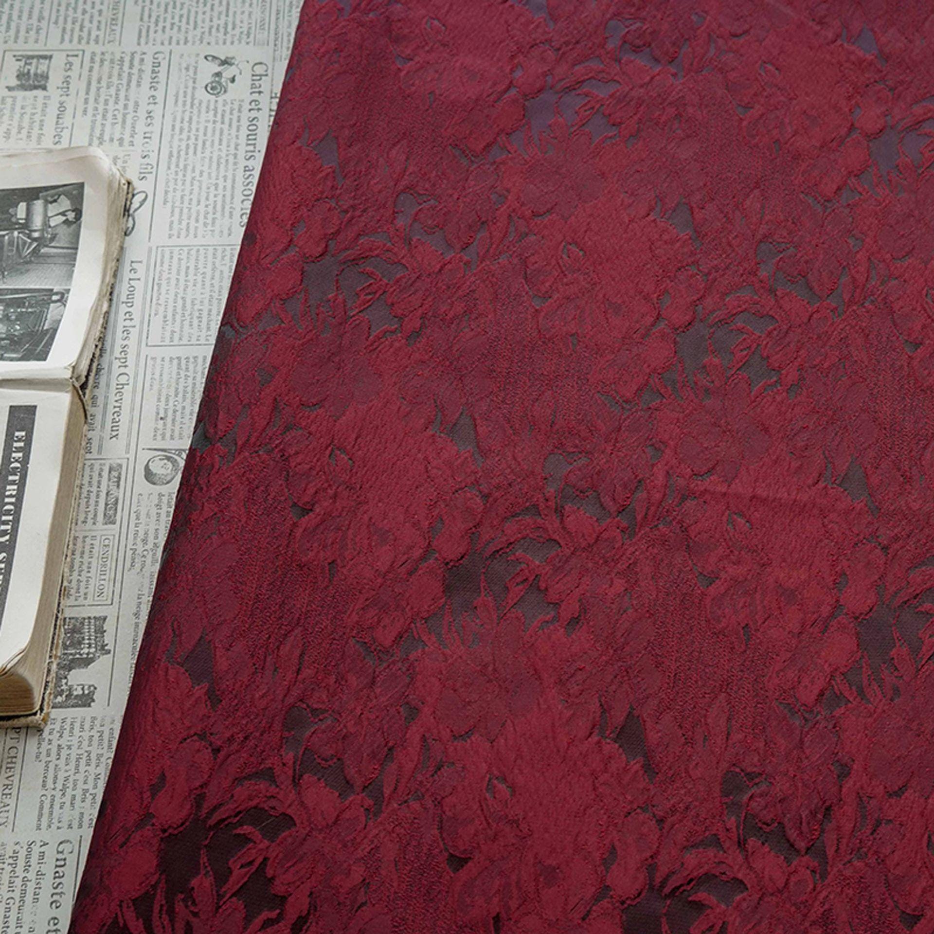 Luxurious Vintage Dark Red 3D Floral Woven Jacquard Fabric, 58"Wide