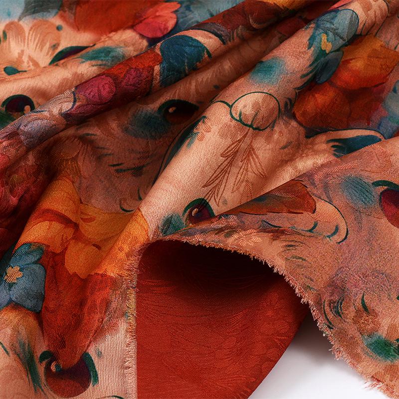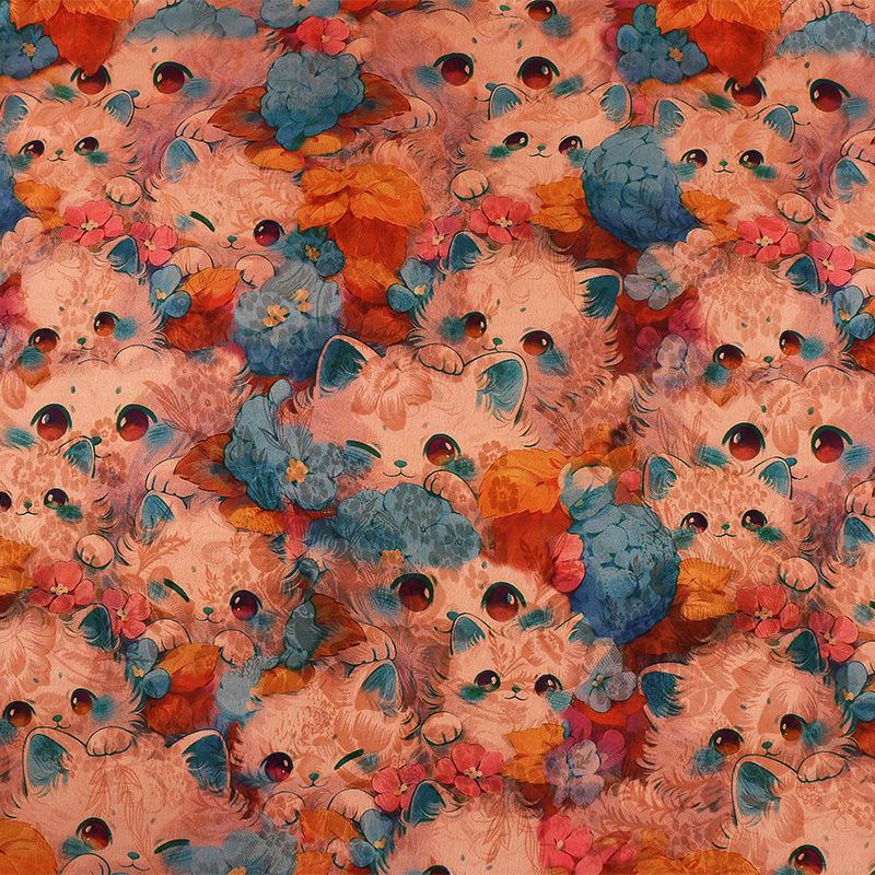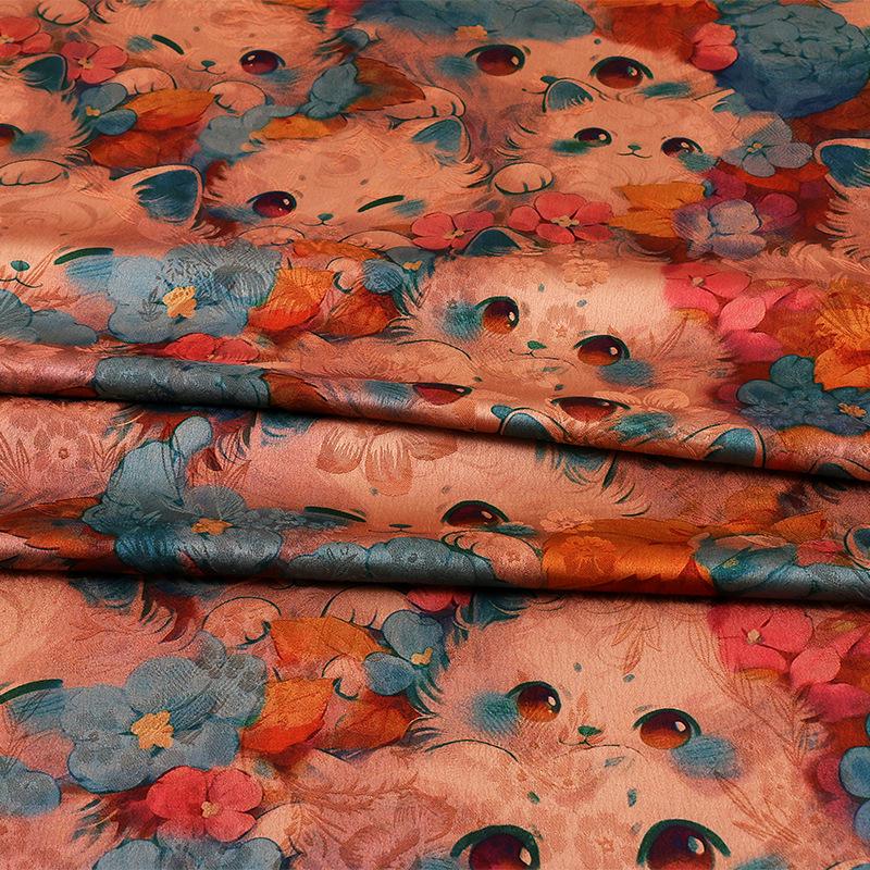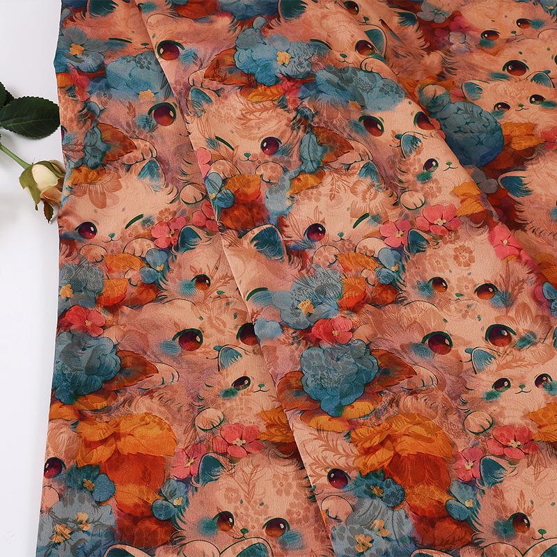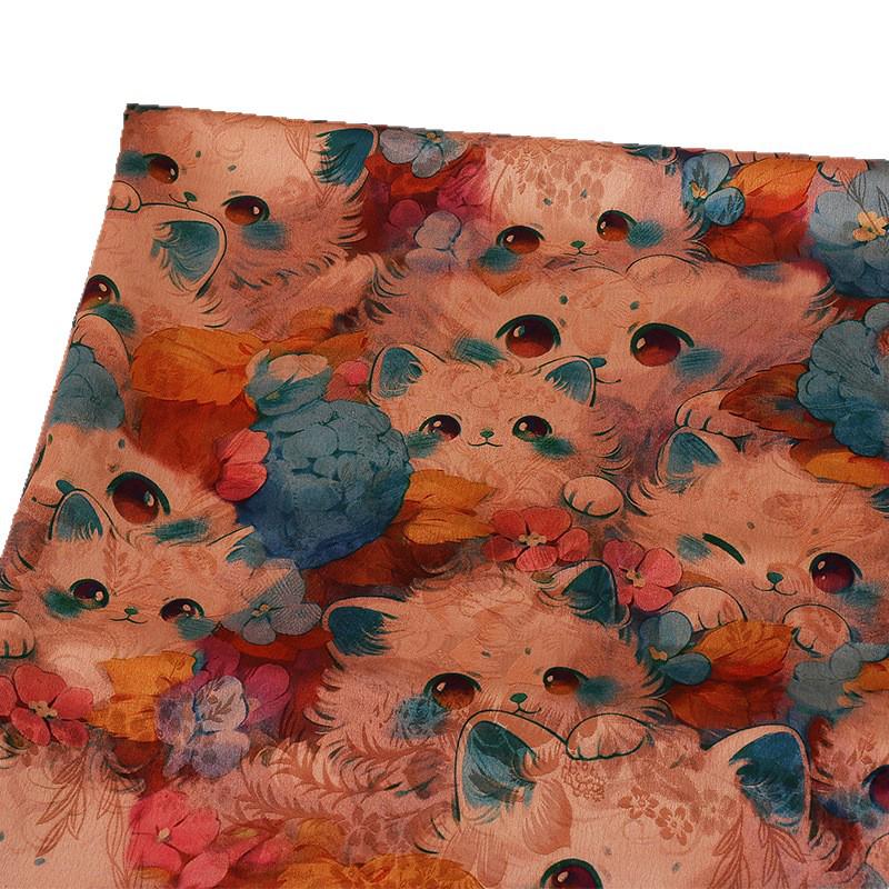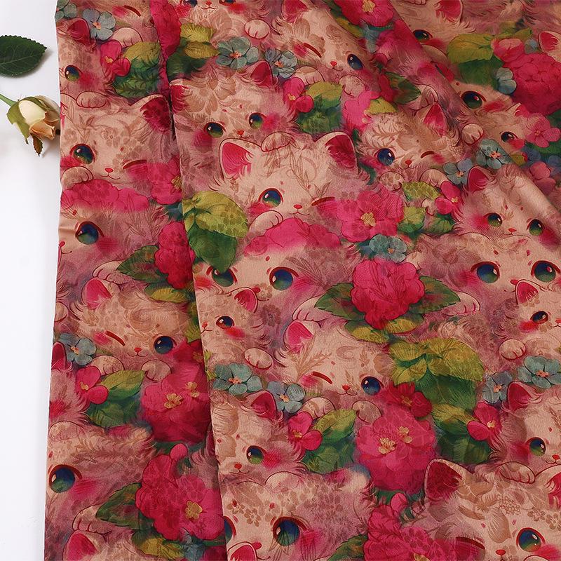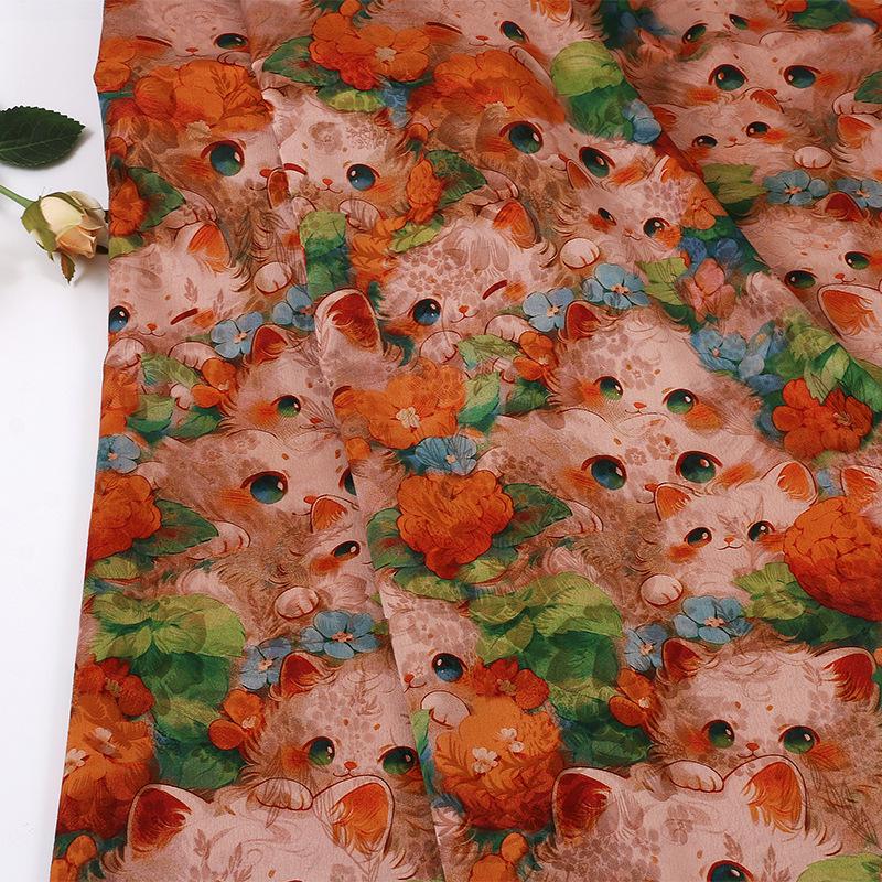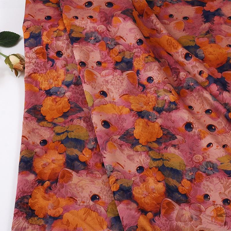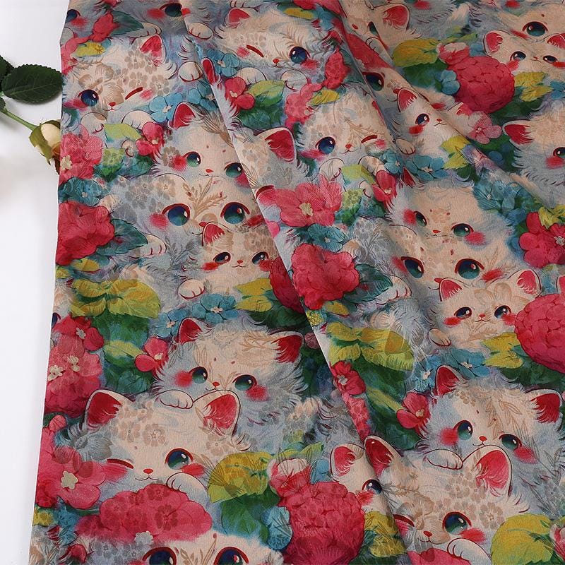 Cartoon Kitten Peony Print on Red Cloud Gauze Fabric – Fun & Playful Design, 59"Wide
