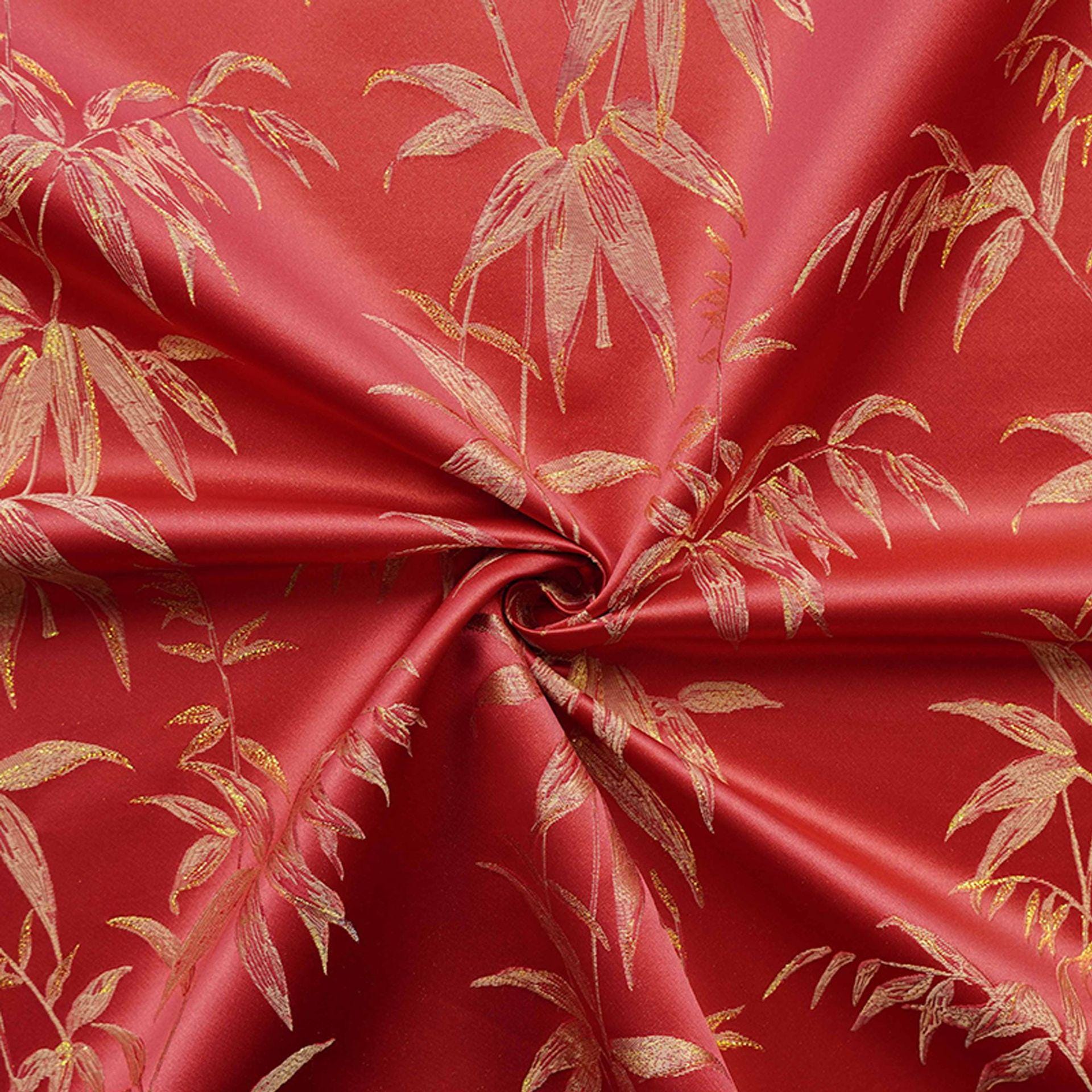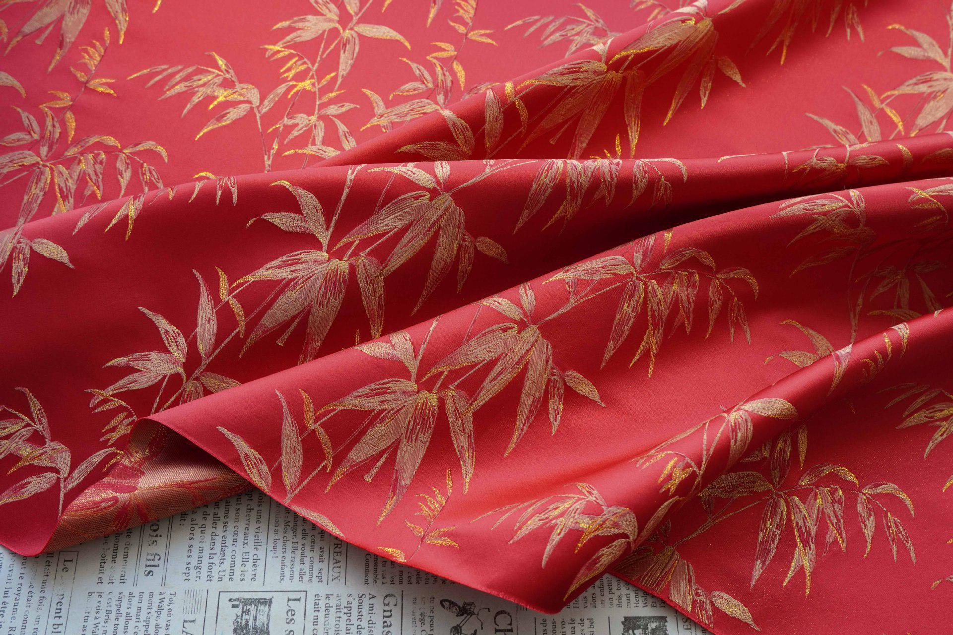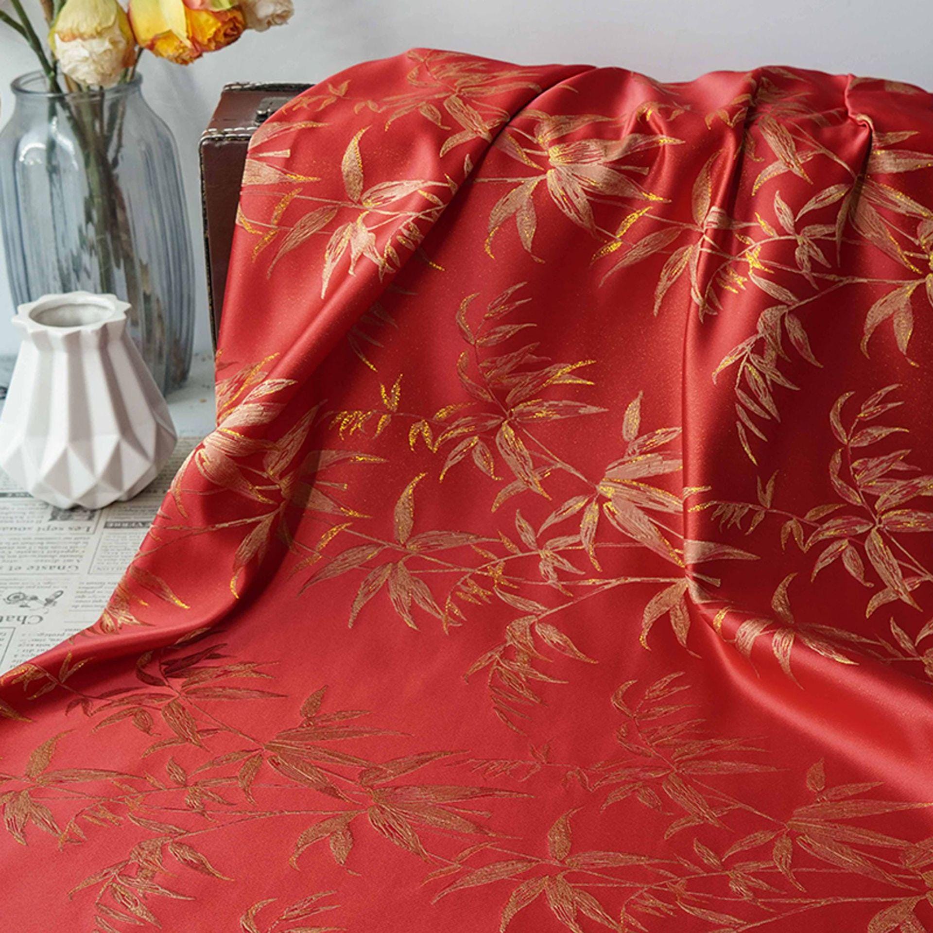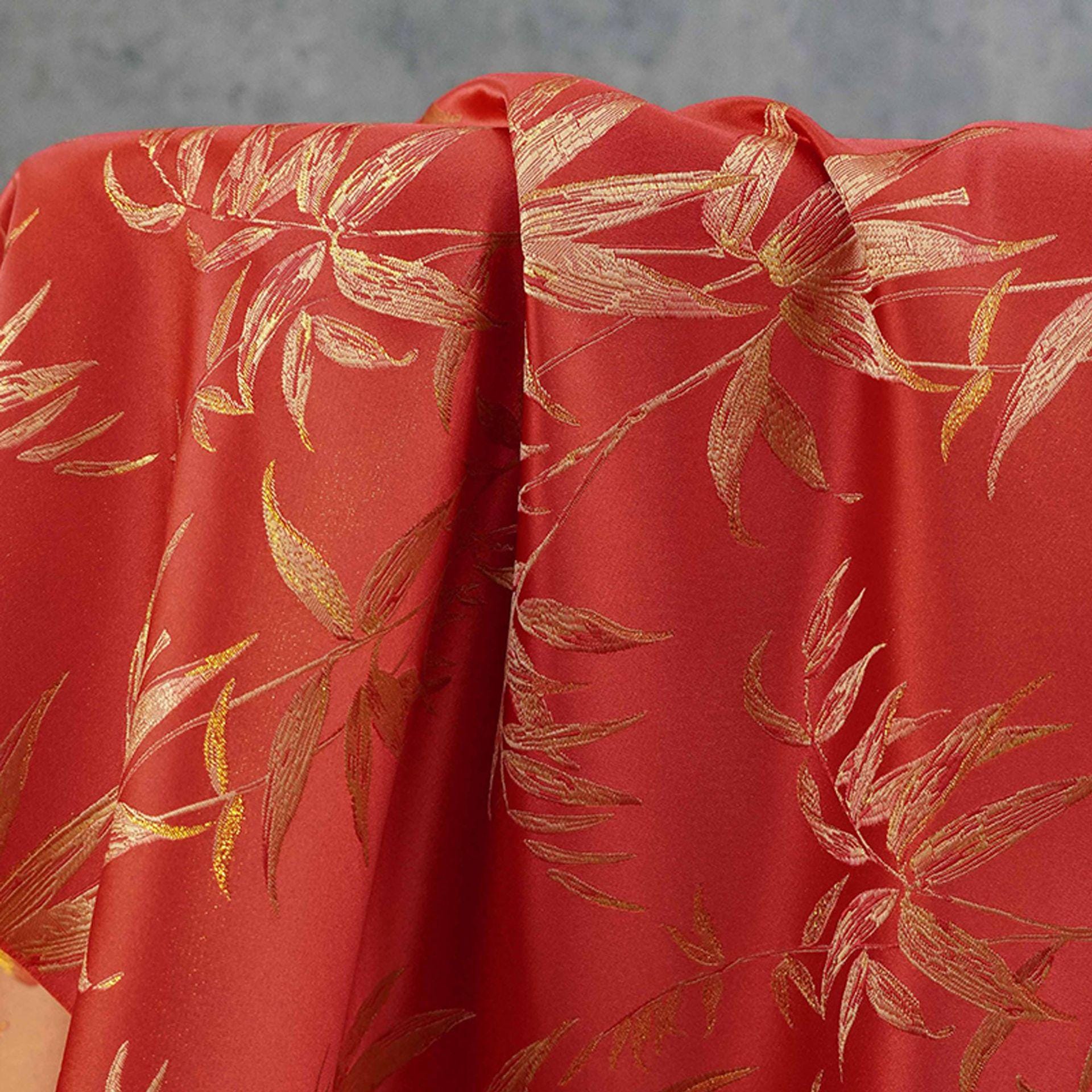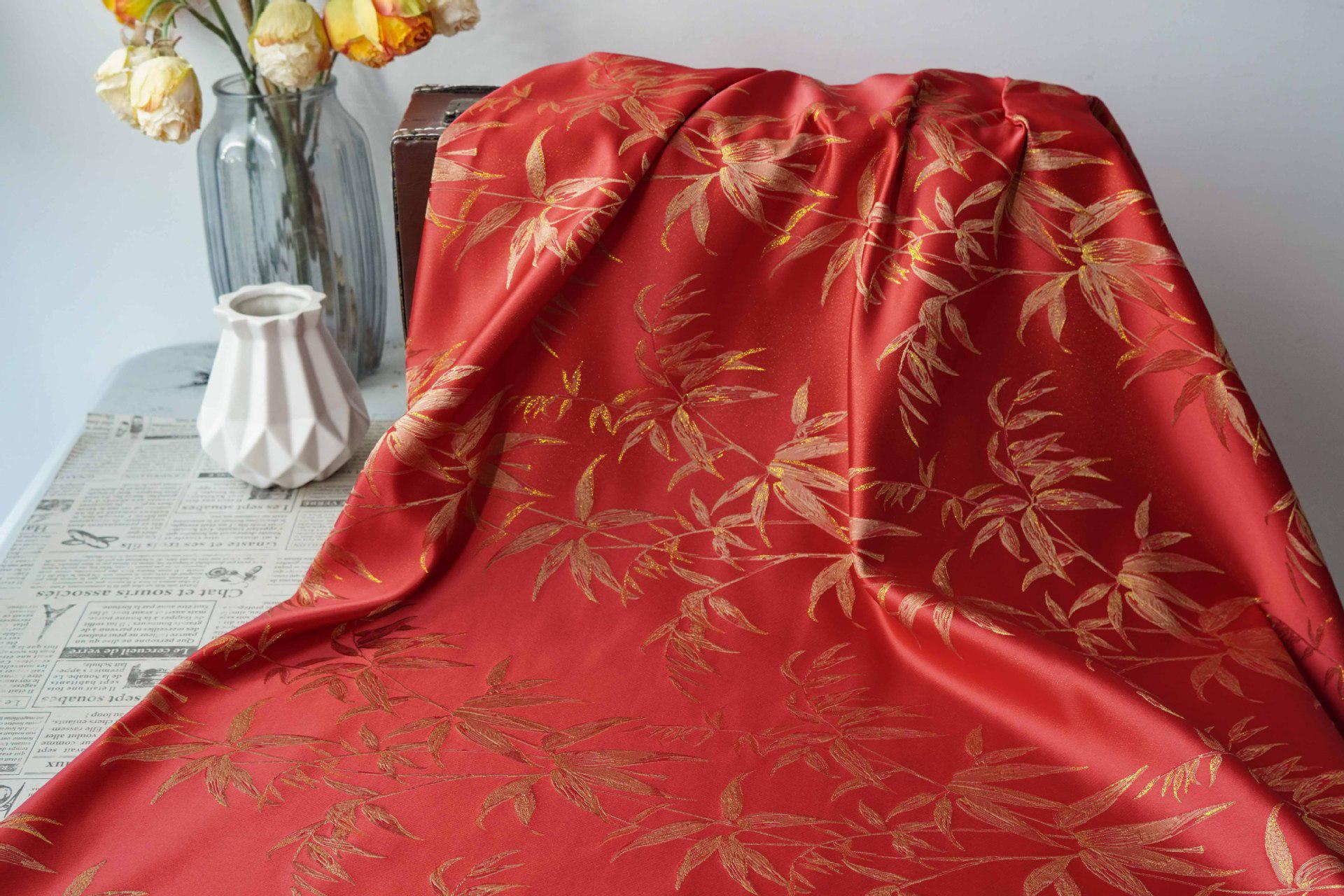 Red Brocade Fabric with Golden Bamboo Leaves – Festive Cheongsam & Hanfu Dress Material | 59" Wide Jacquard Upholstery, Coat Decor Fabric