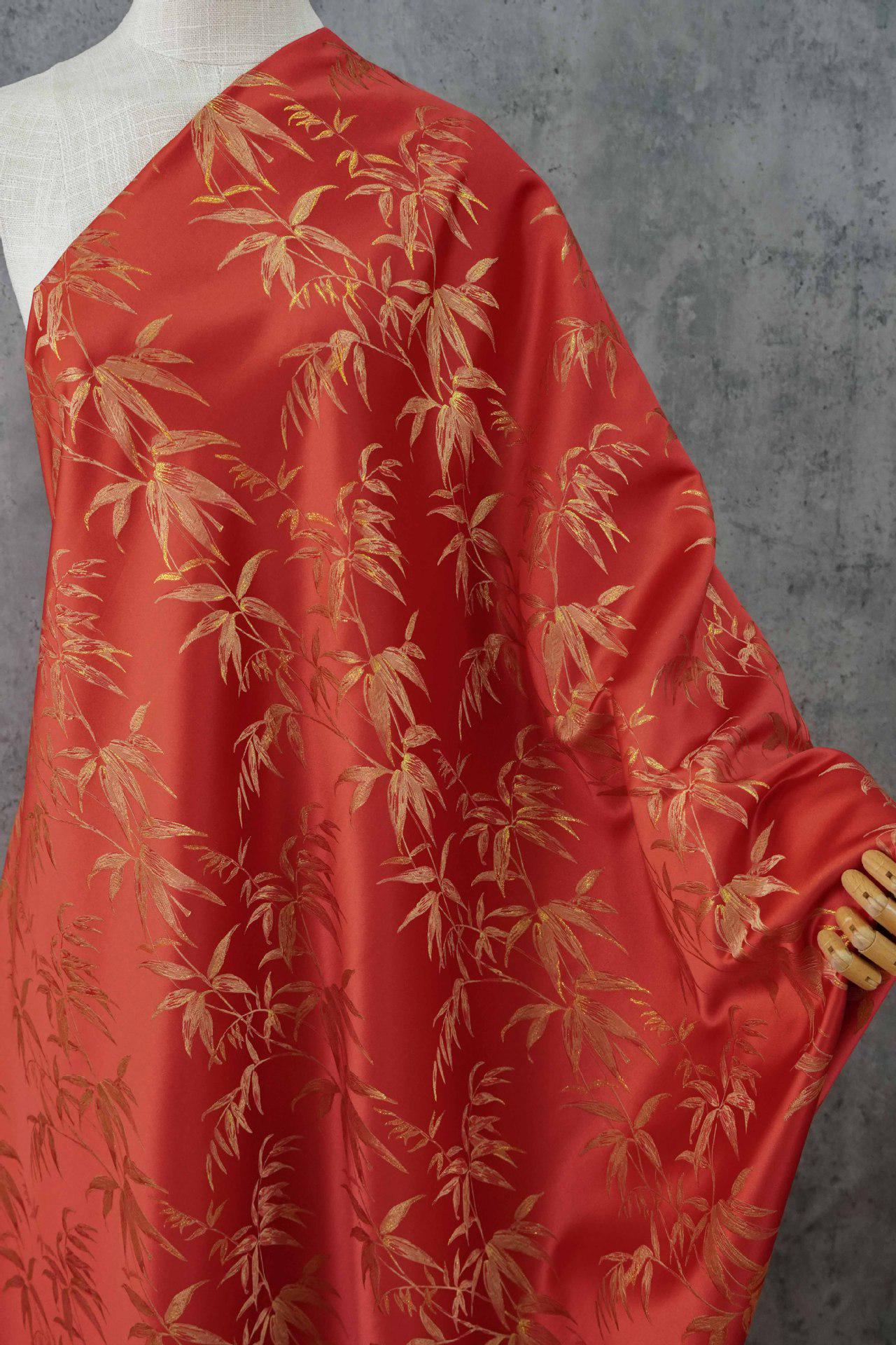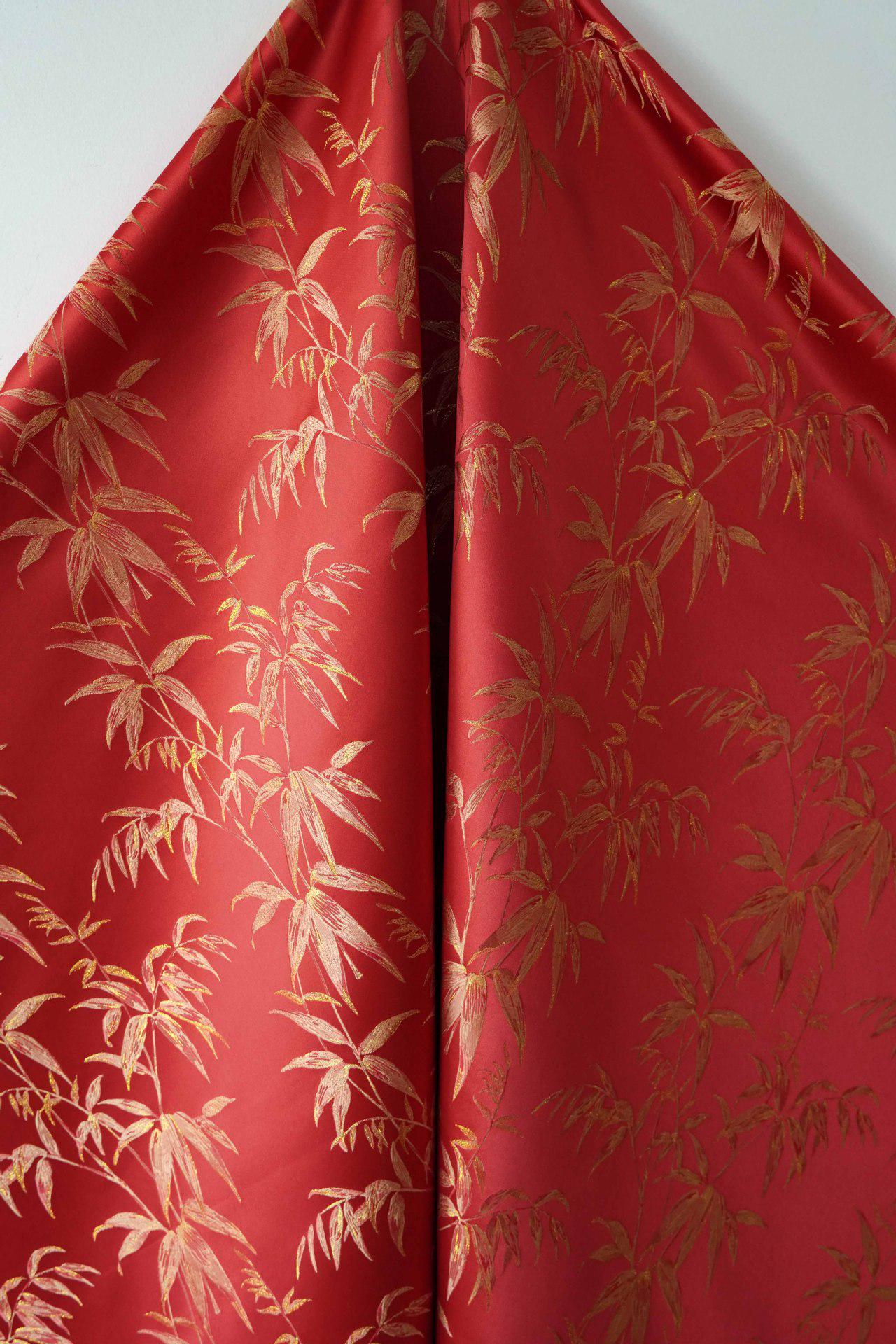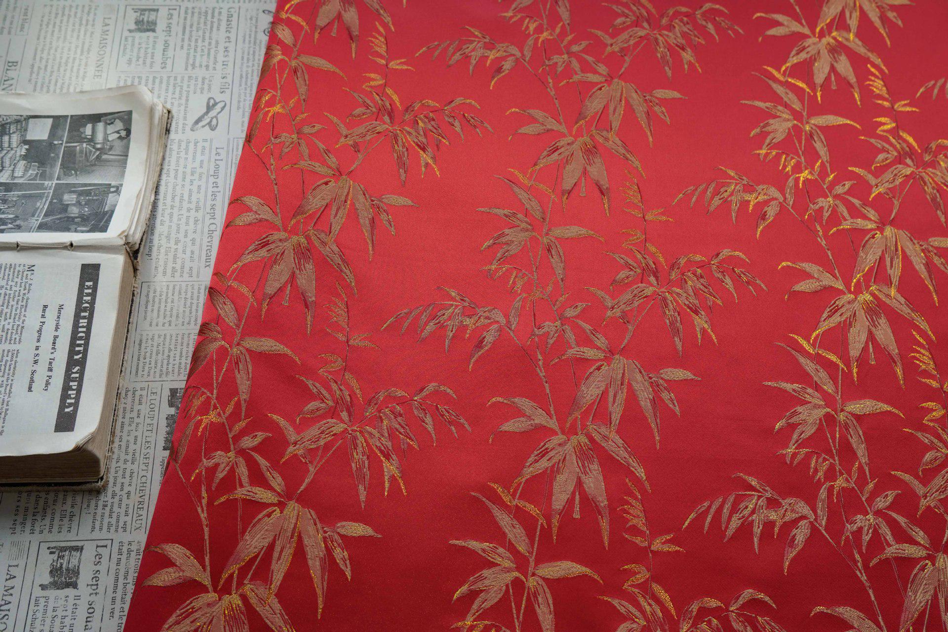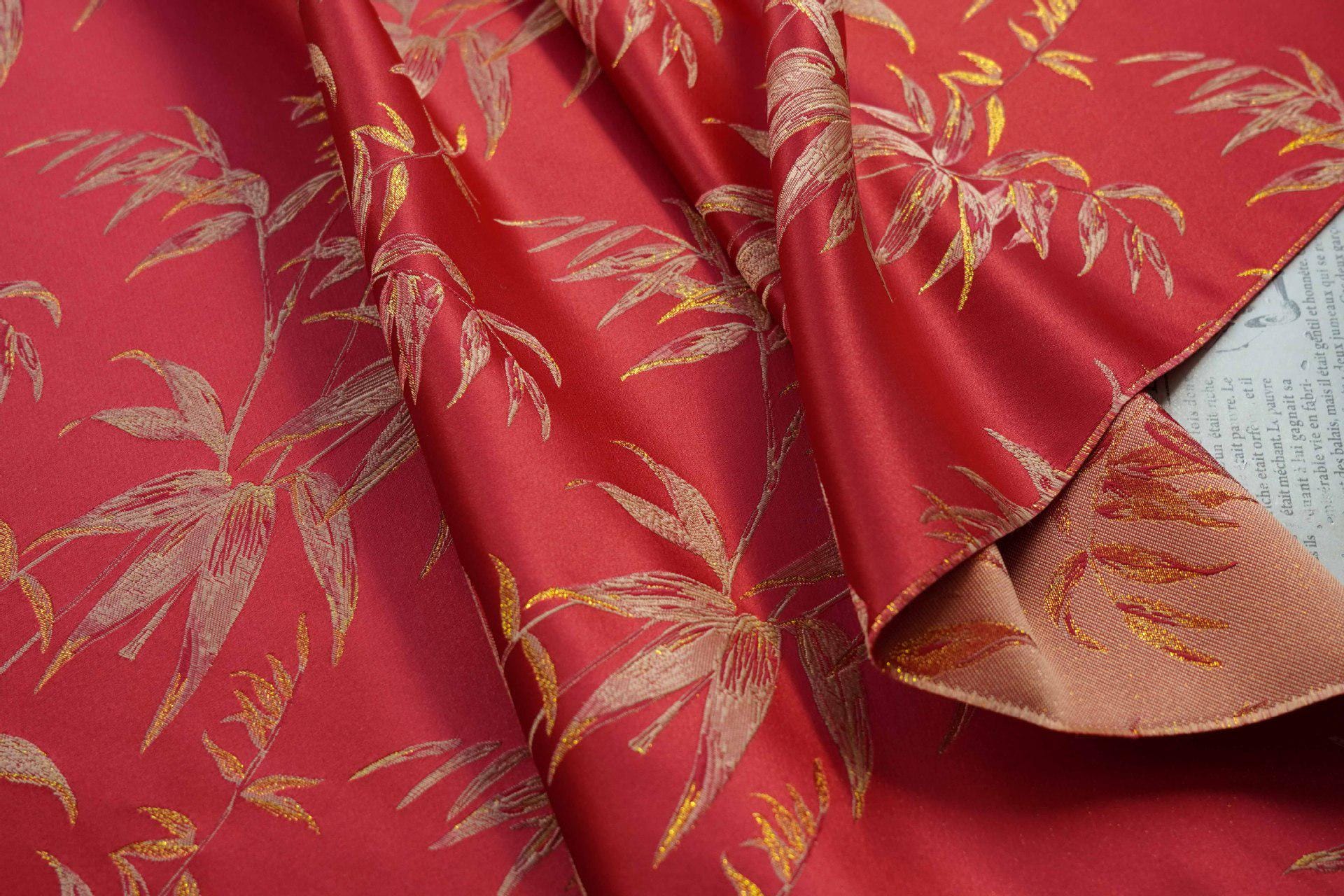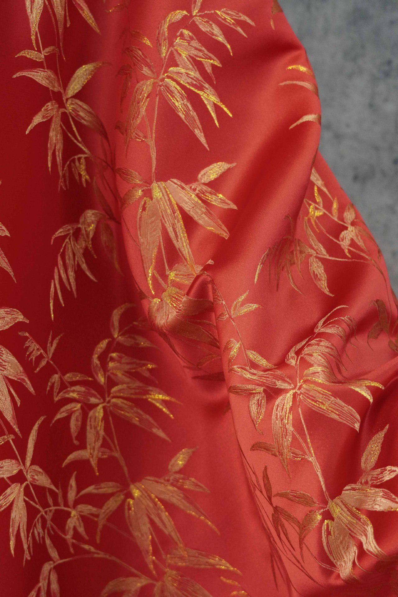 Red Brocade Fabric with Golden Bamboo Leaves – Festive Cheongsam & Hanfu Dress Material | 59" Wide Jacquard Upholstery, Coat Decor Fabric