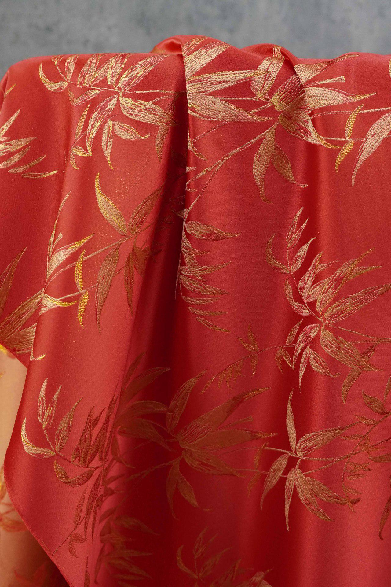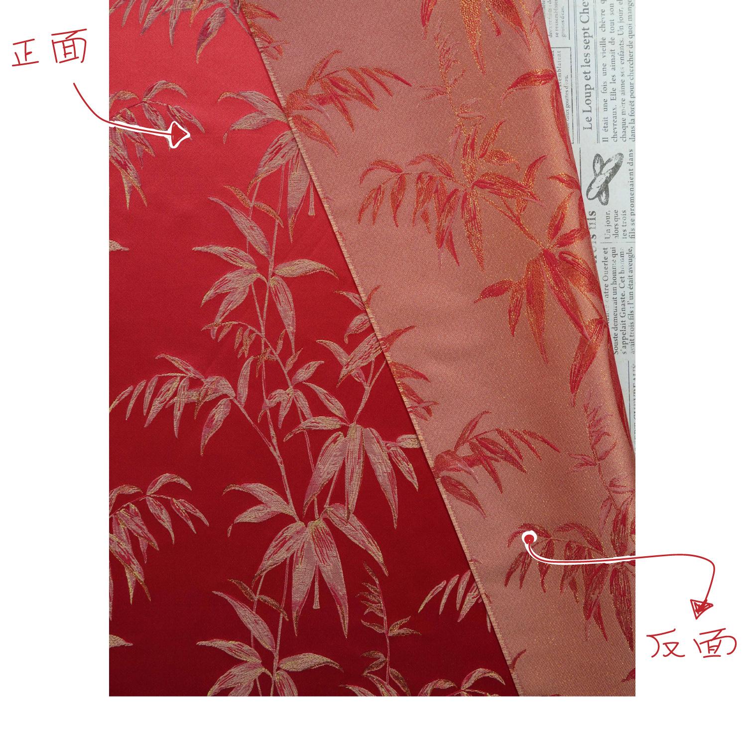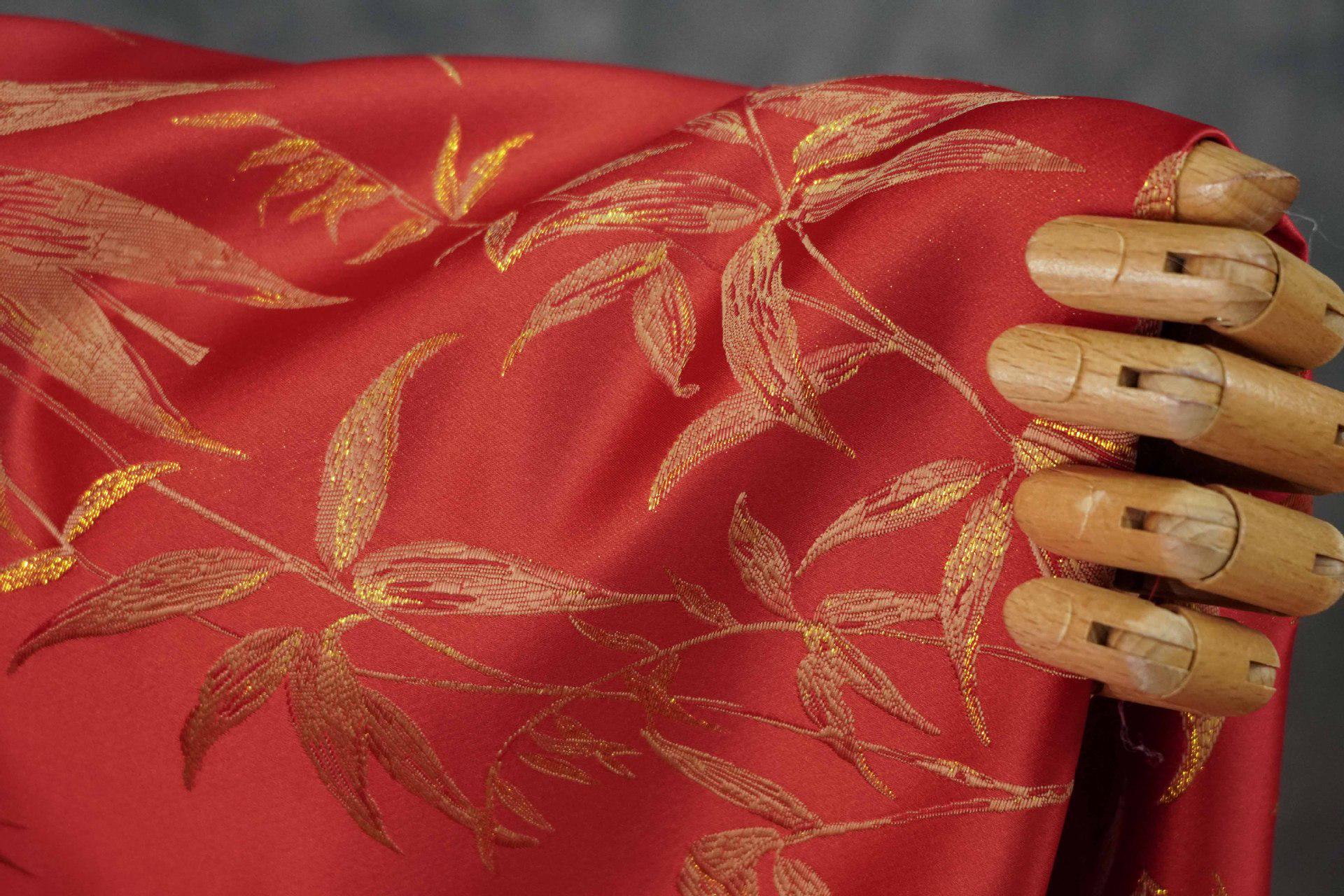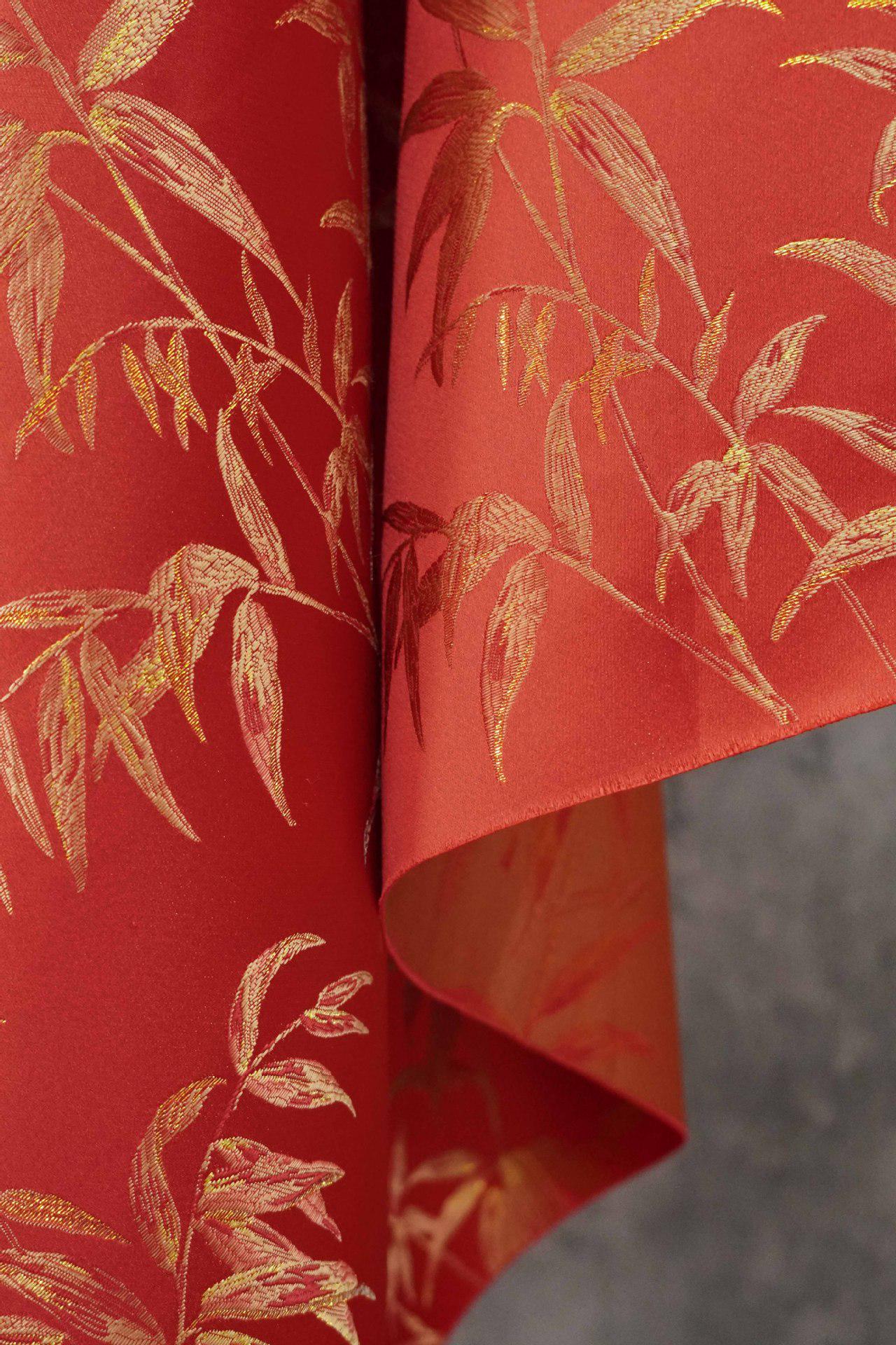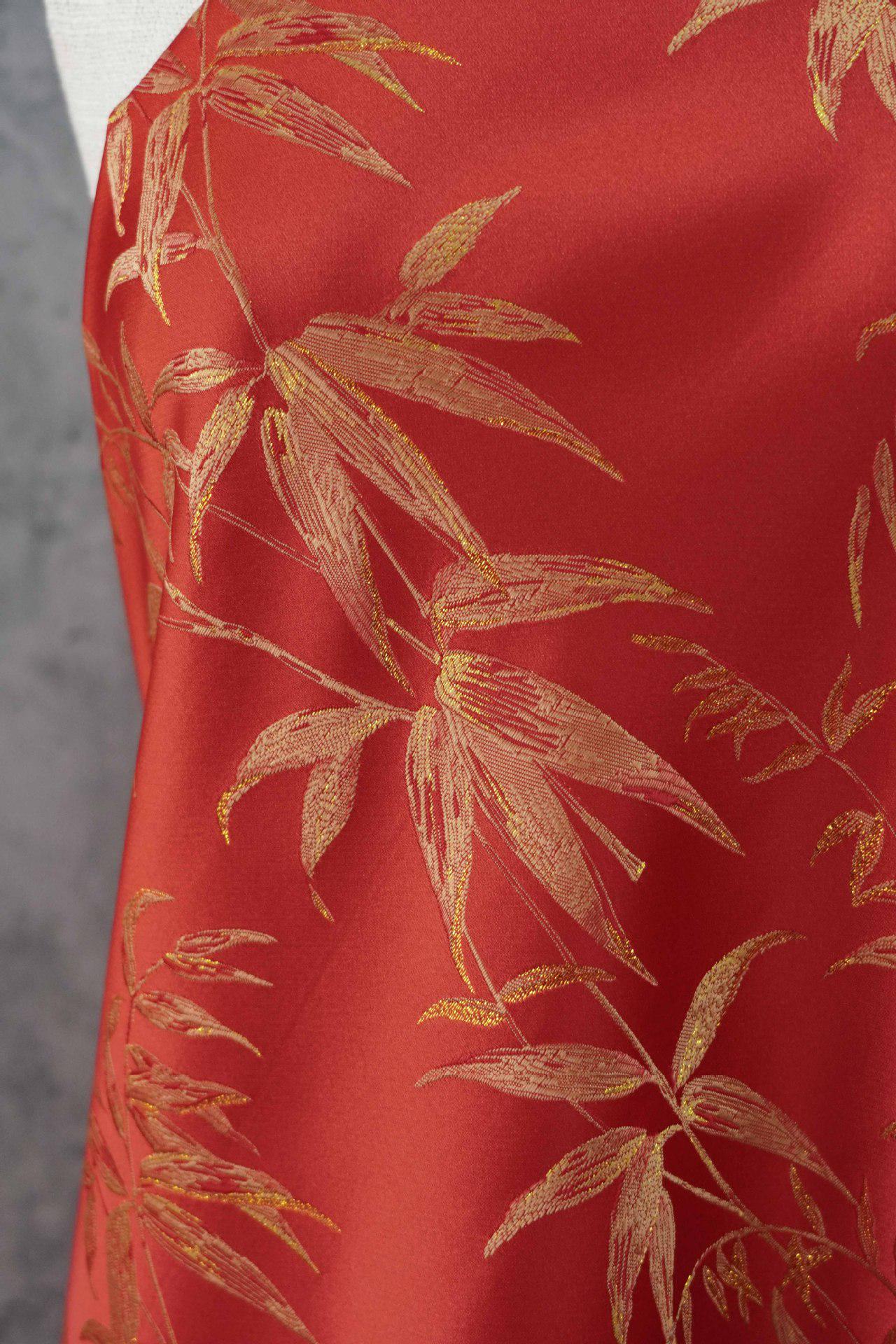 Red Brocade Fabric with Golden Bamboo Leaves – Festive Cheongsam & Hanfu Dress Material | 59" Wide Jacquard Upholstery, Coat Decor Fabric