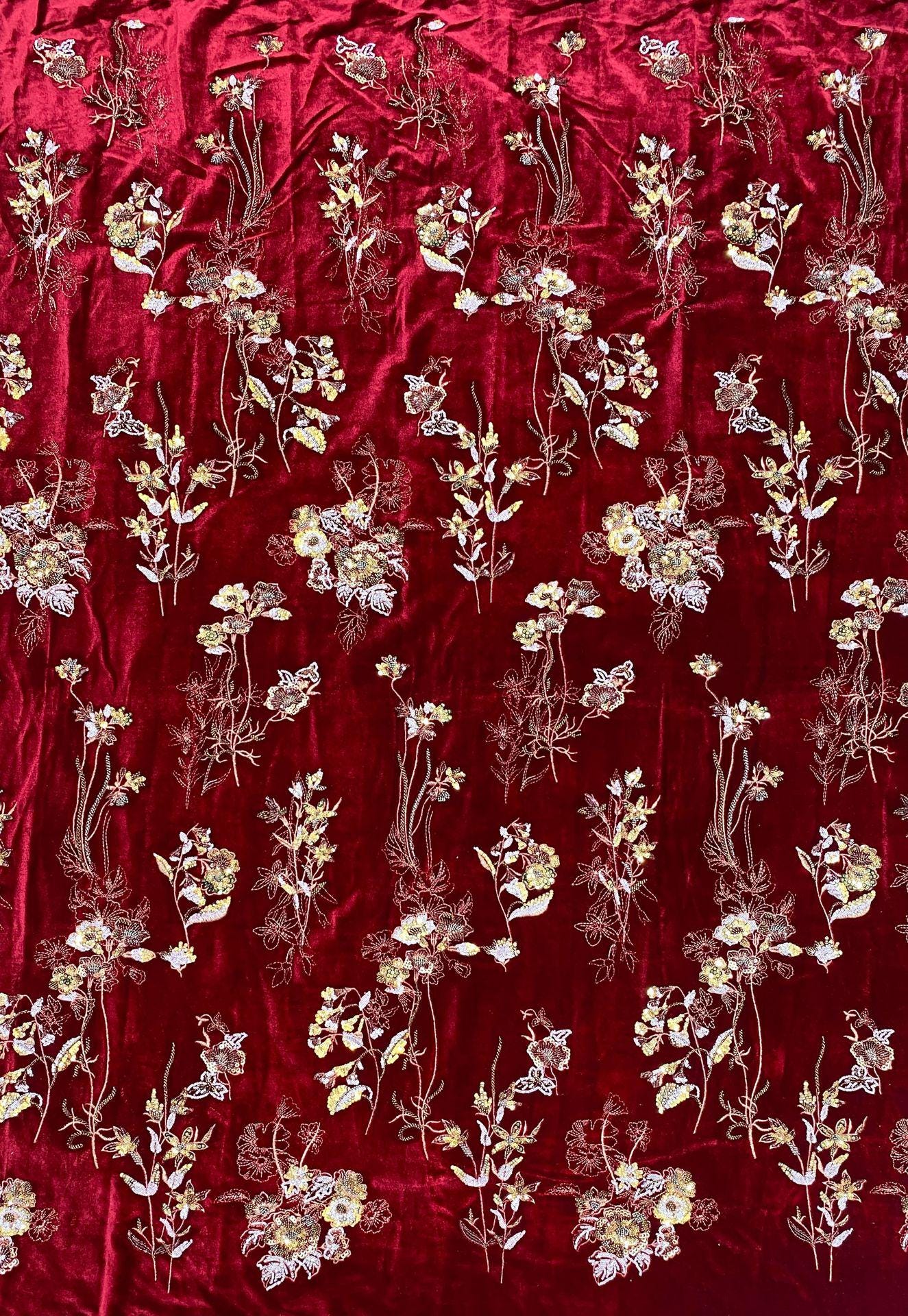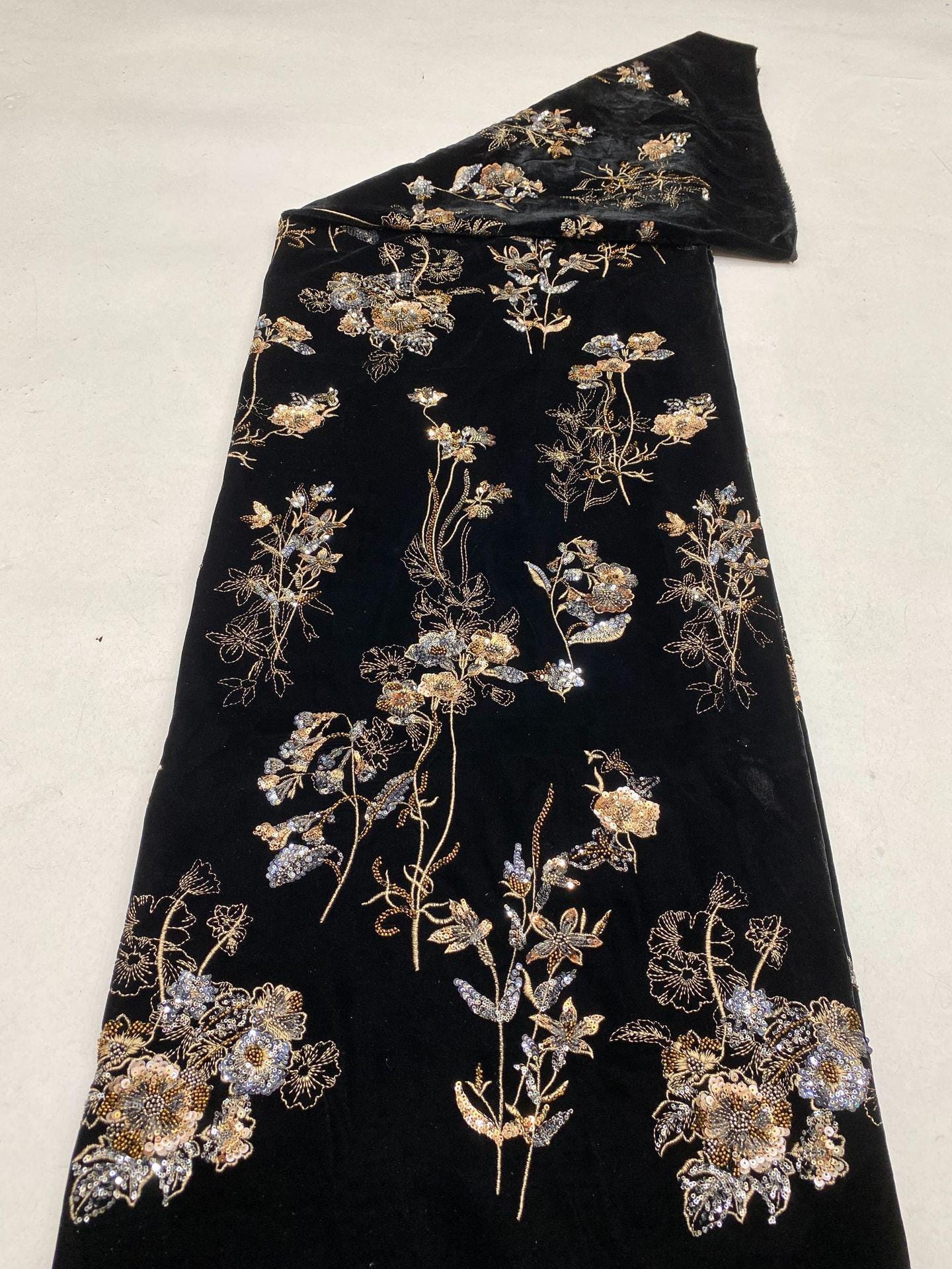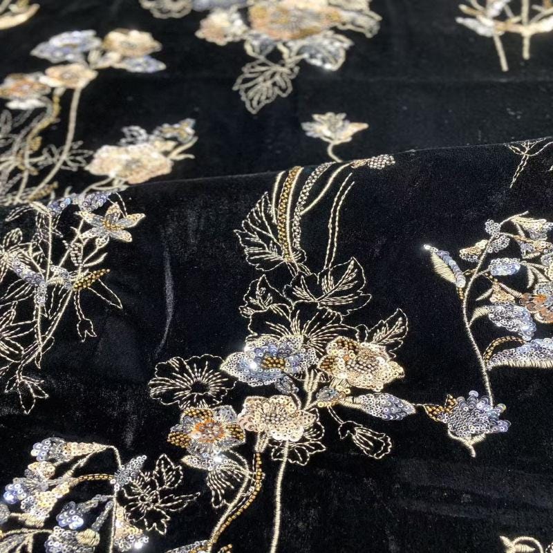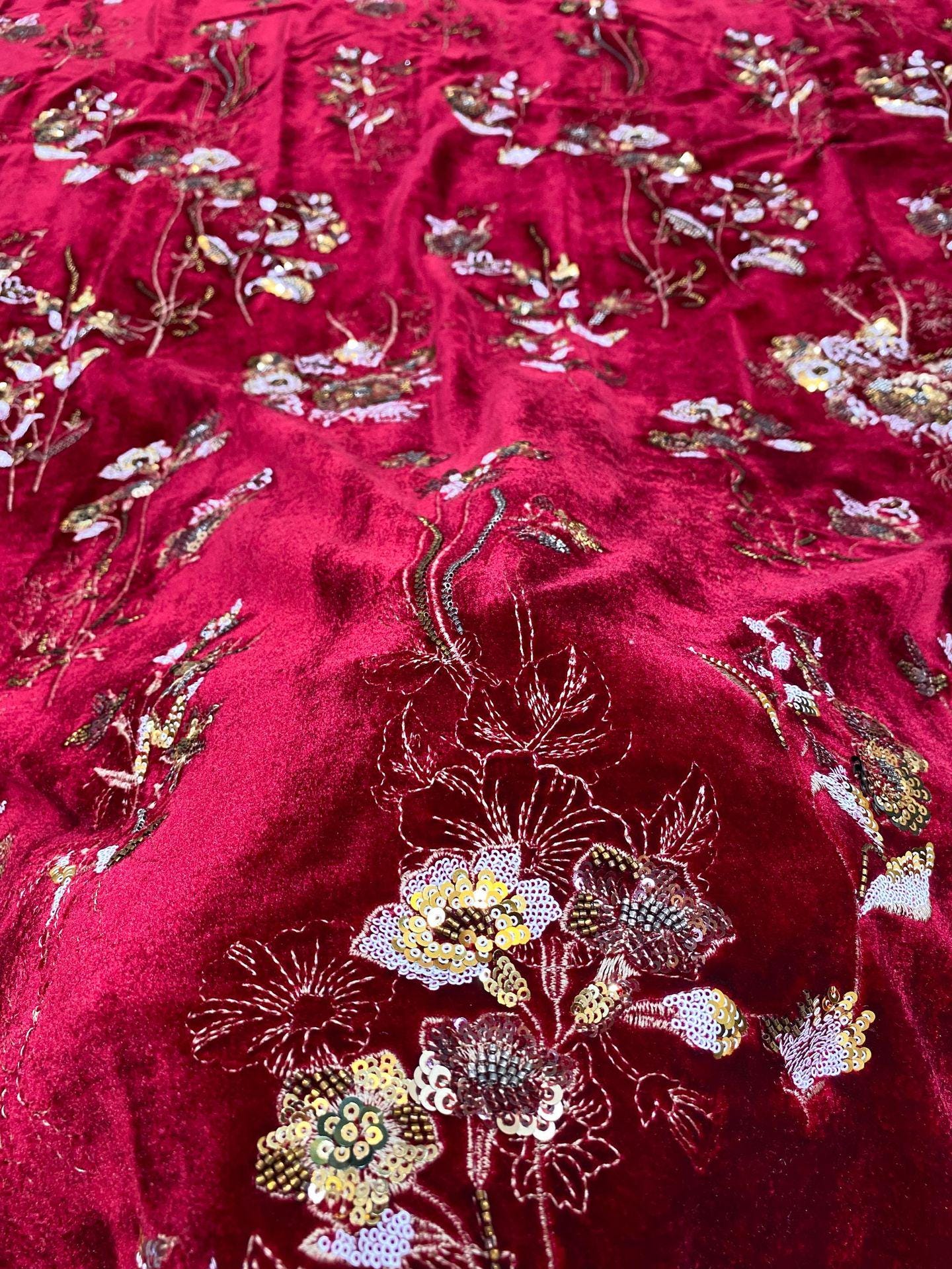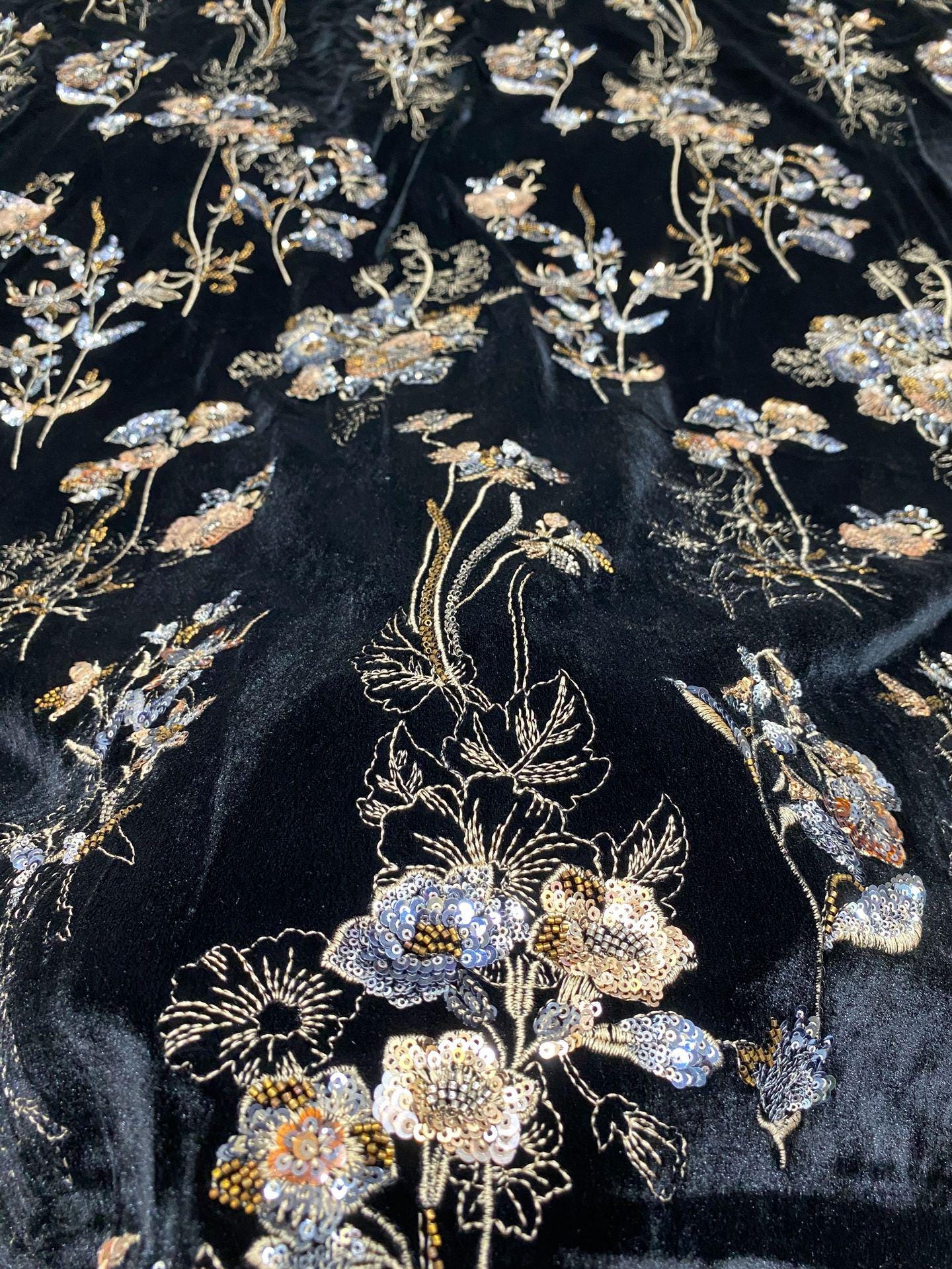 Beaded Sequin Velvet Fabric – Embroidered Floral Design, 49" Wide
