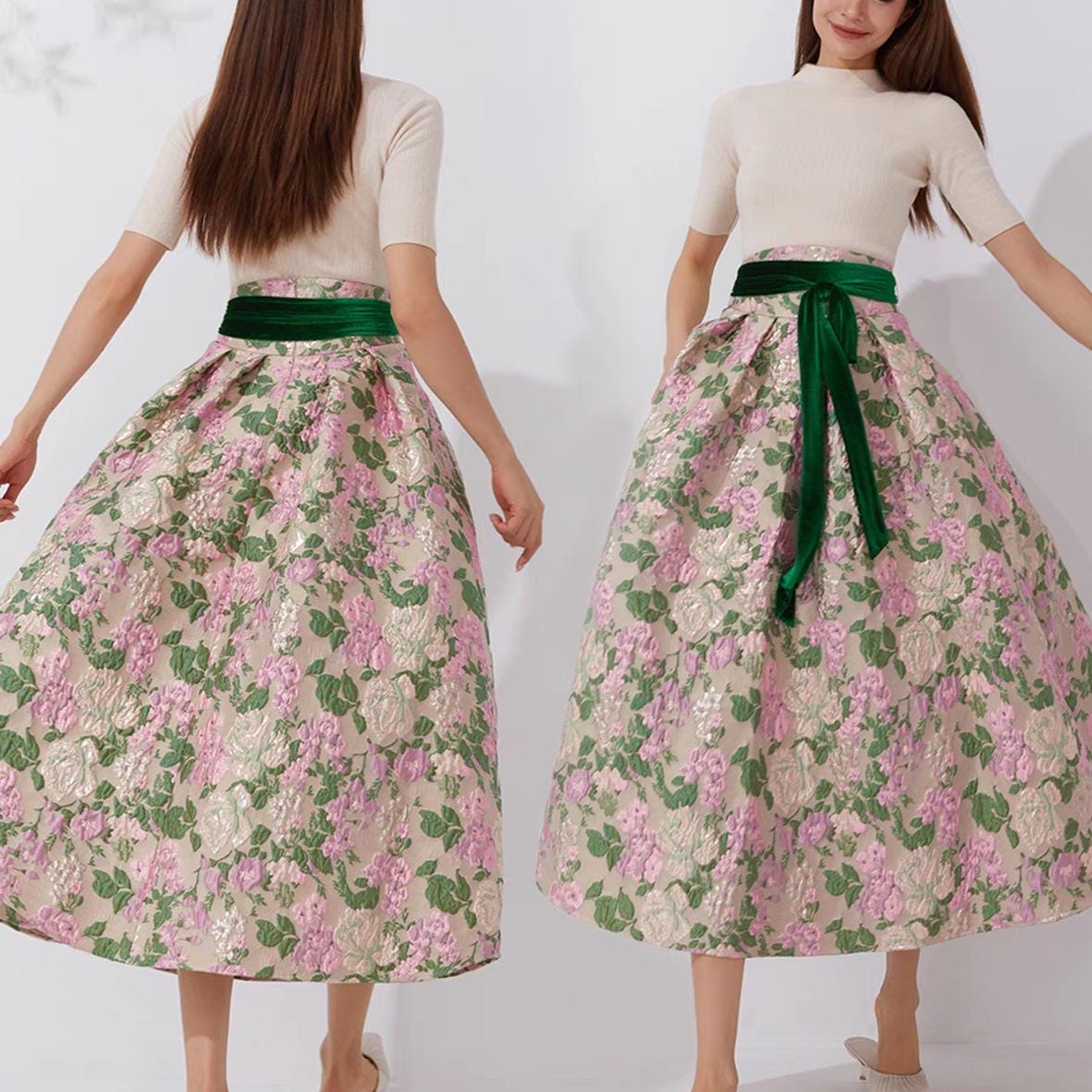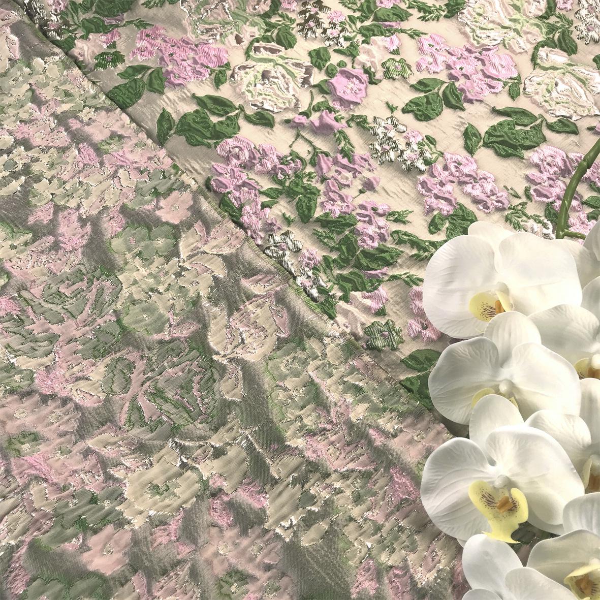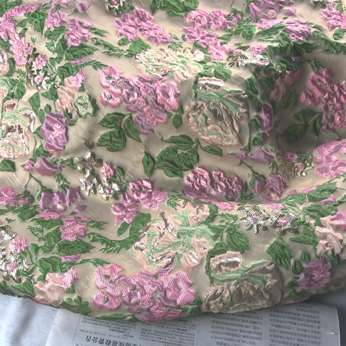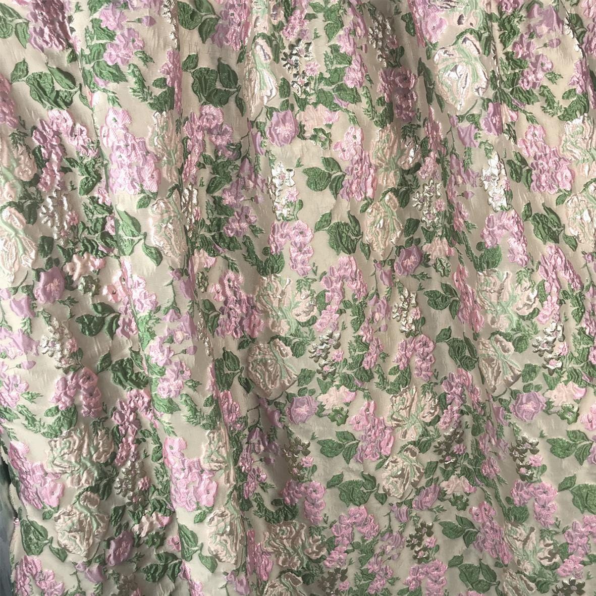 "This fabric has a unique style, dense fabric, elegant and delicate flowers, beige apricot background with a matte texture, and a slightly crisp feel. It is a high-quality spring, autumn and winter fashion fabric."
