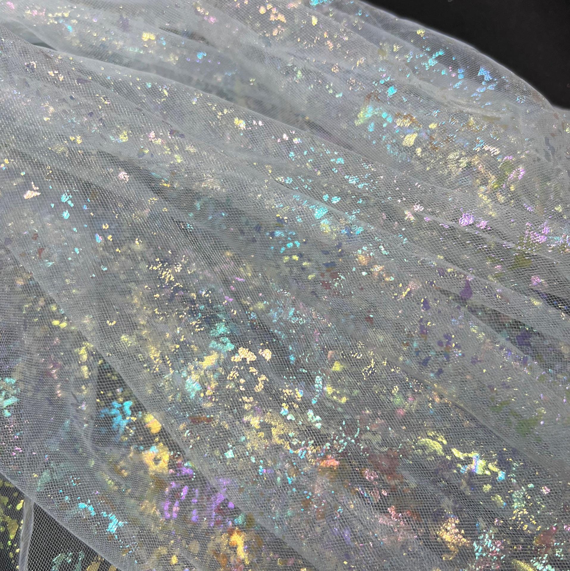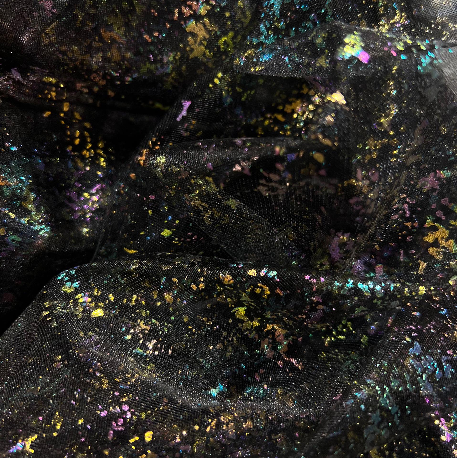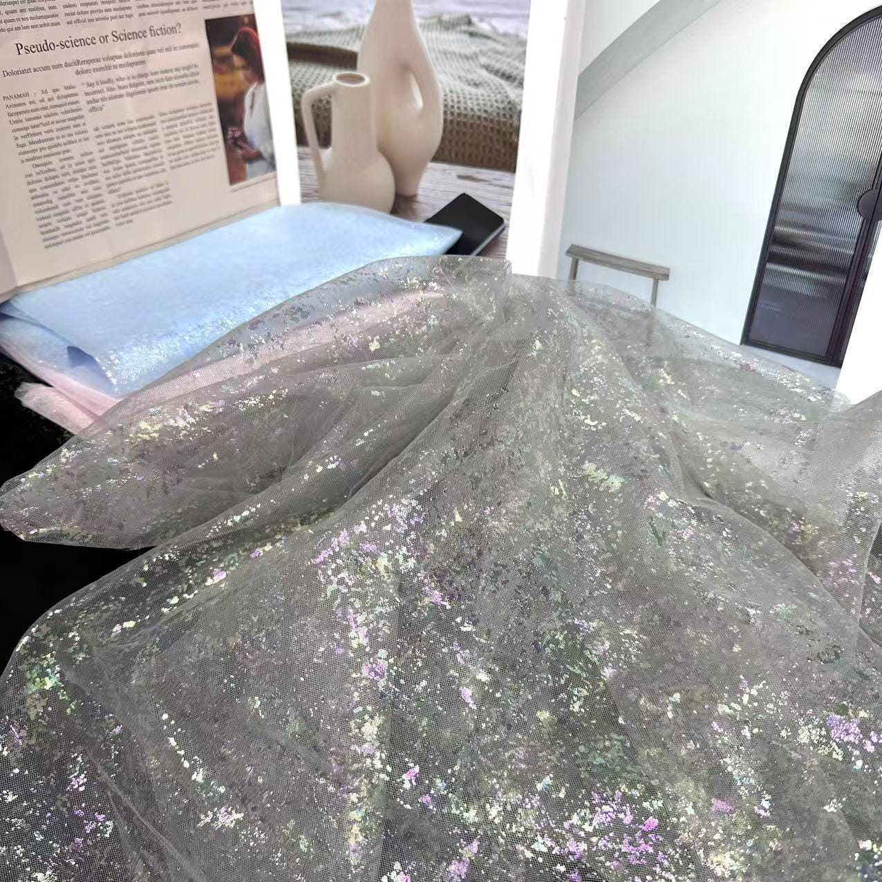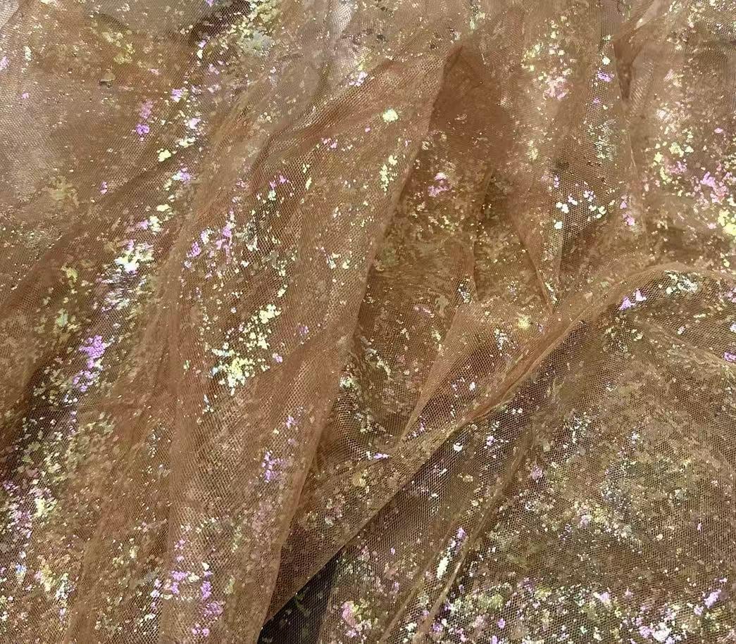 This fabric boasts a lustrous finish resembling silk, achieved with light and airy pearlescent gradient yarn. The glossy curve from top to bottom features meandering waves, lending the fabric a beautiful and harmonious quality that is both elegant and alluring. With its slightly sheer and seductive perspective, this fabric adds a touch of sophistication to any design. Additionally, it can be layered with other fabrics to create unique and versatile looks.