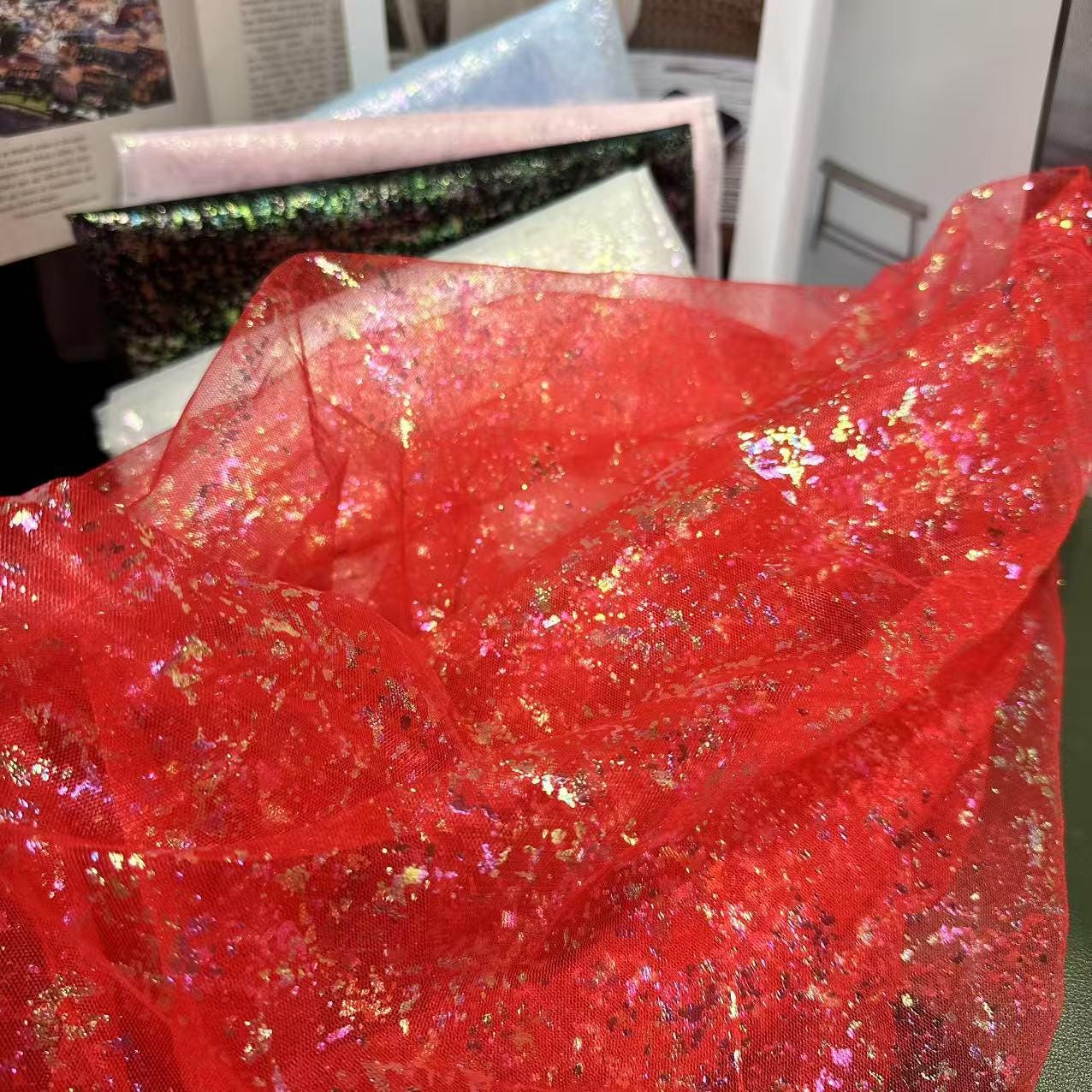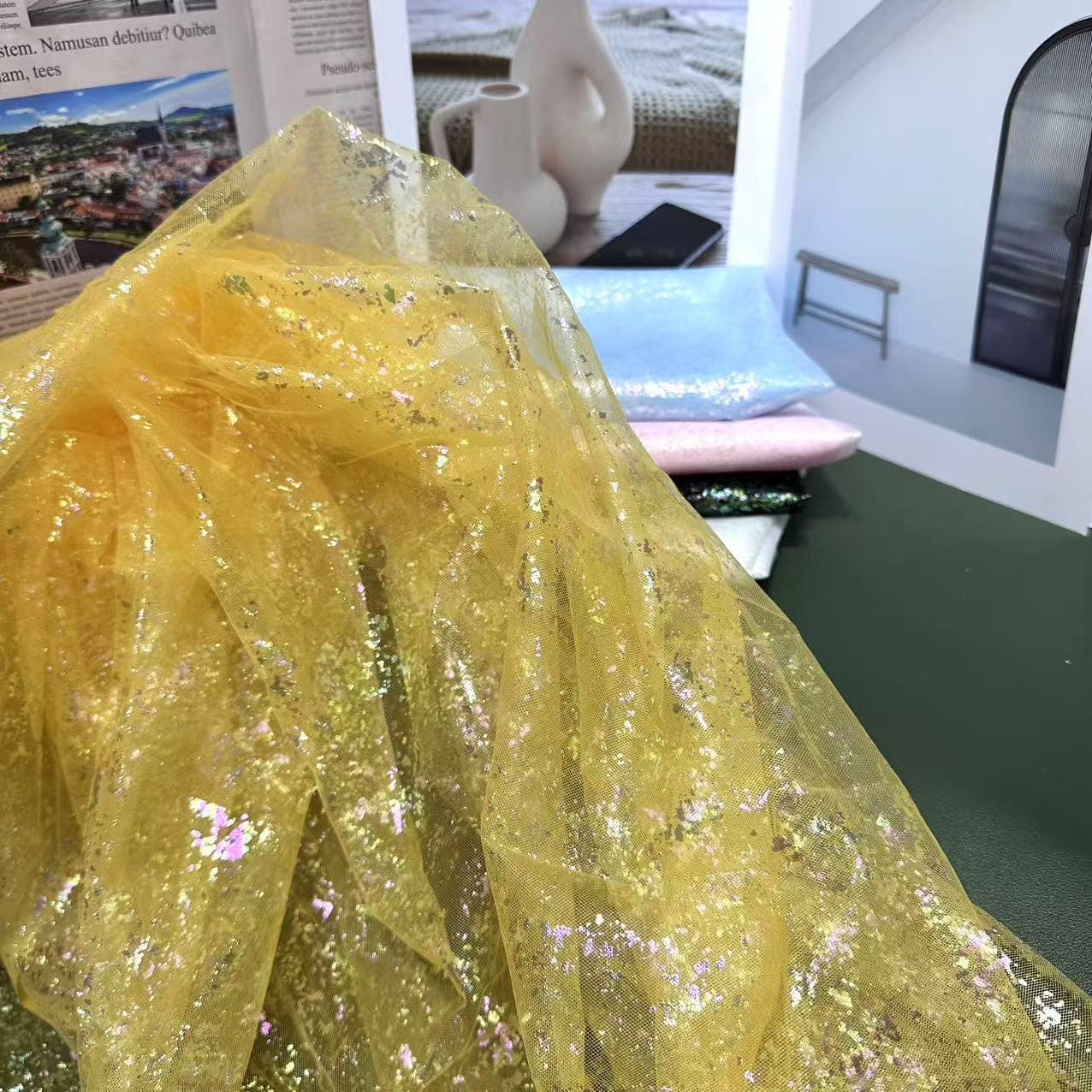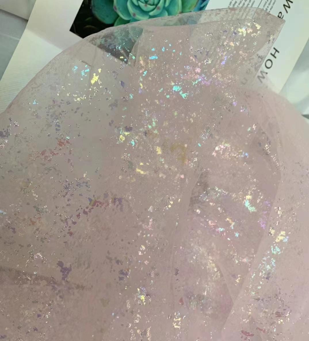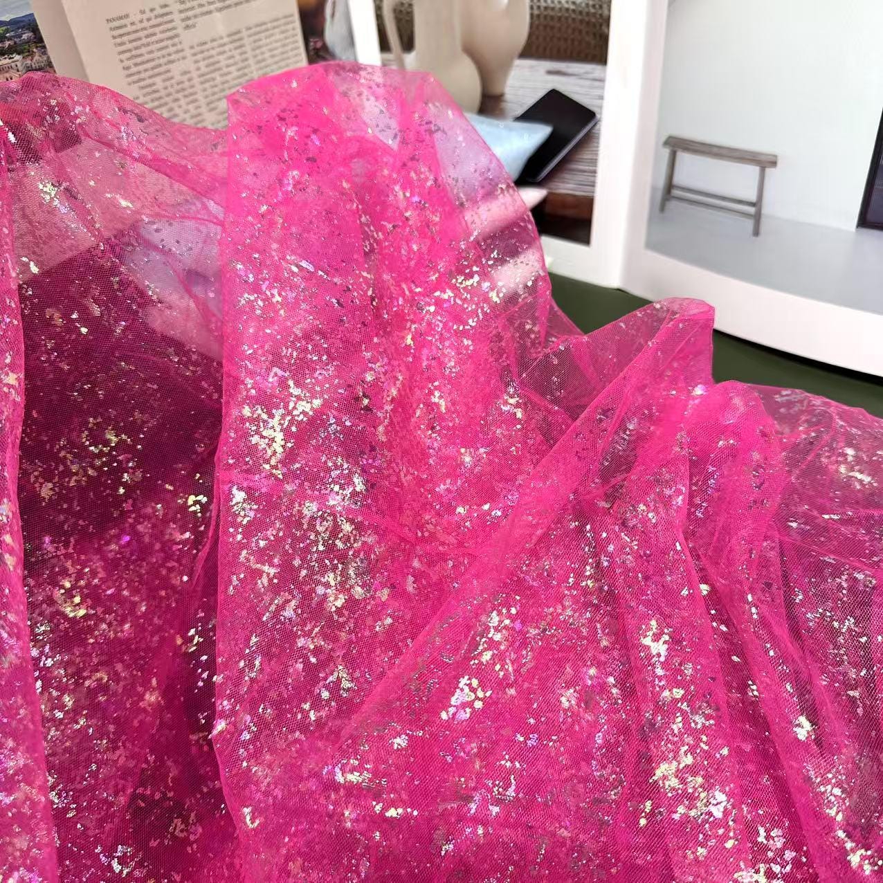 This fabric boasts a lustrous finish resembling silk, achieved with light and airy pearlescent gradient yarn. The glossy curve from top to bottom features meandering waves, lending the fabric a beautiful and harmonious quality that is both elegant and alluring. With its slightly sheer and seductive perspective, this fabric adds a touch of sophistication to any design. Additionally, it can be layered with other fabrics to create unique and versatile looks.