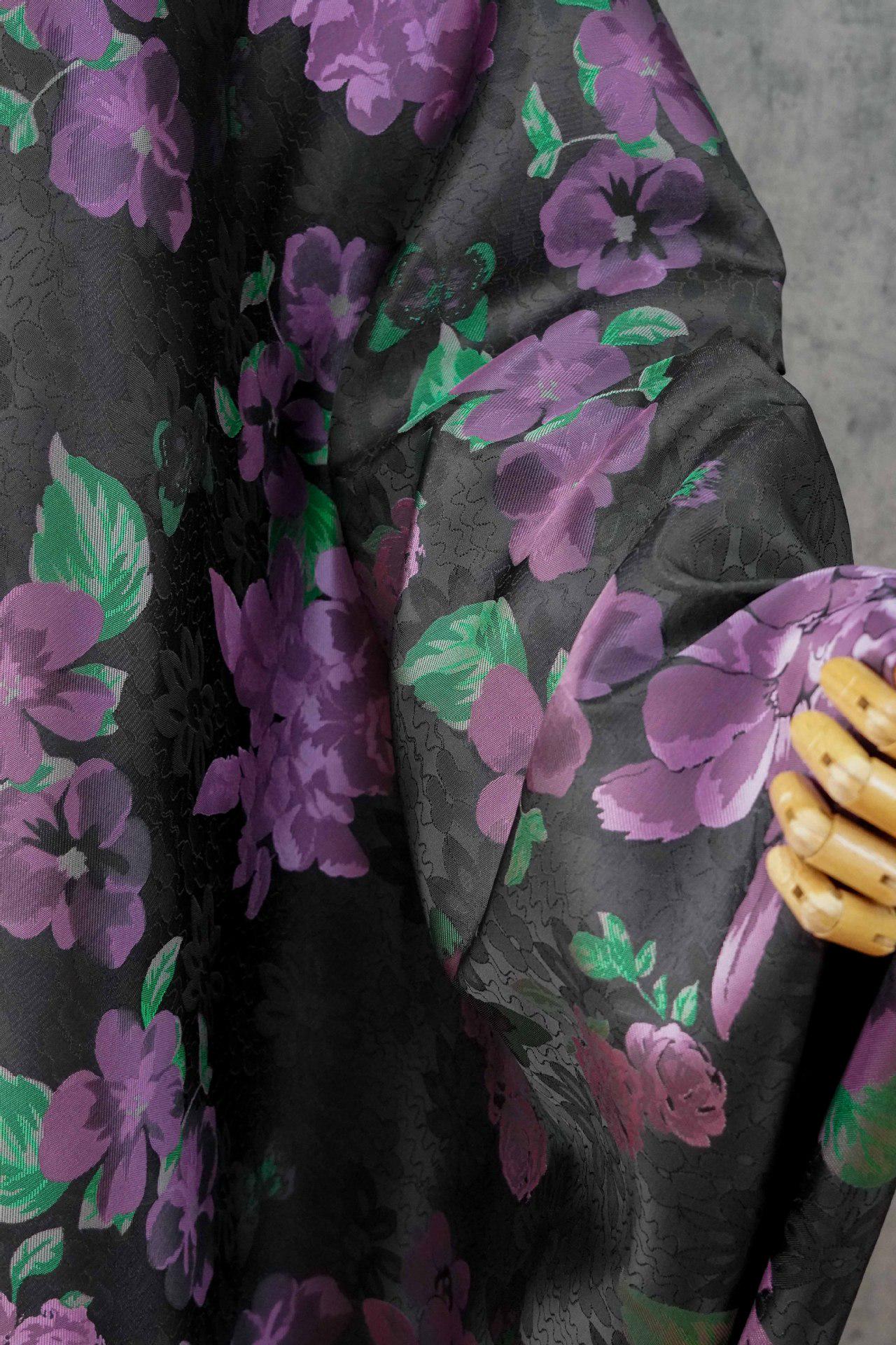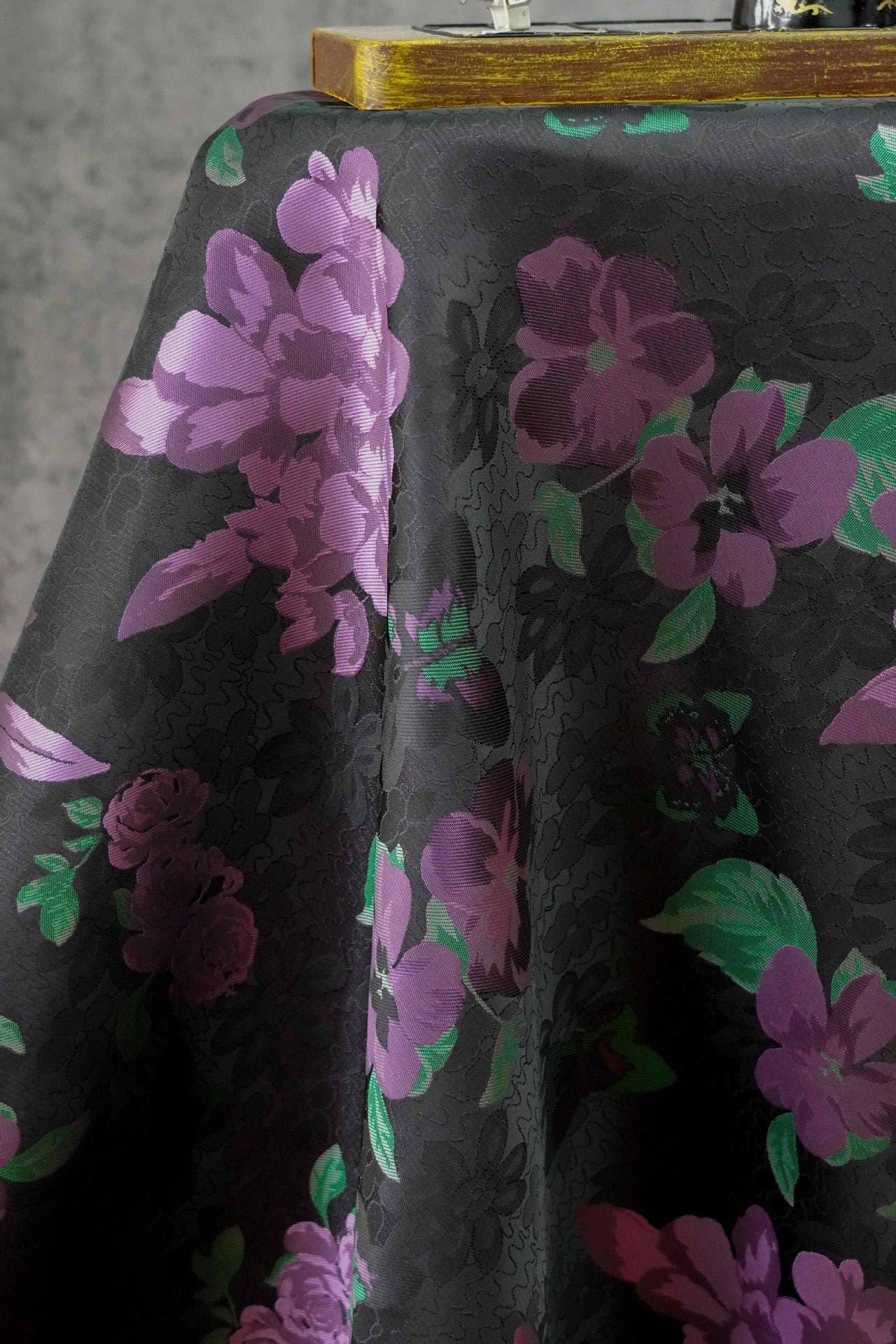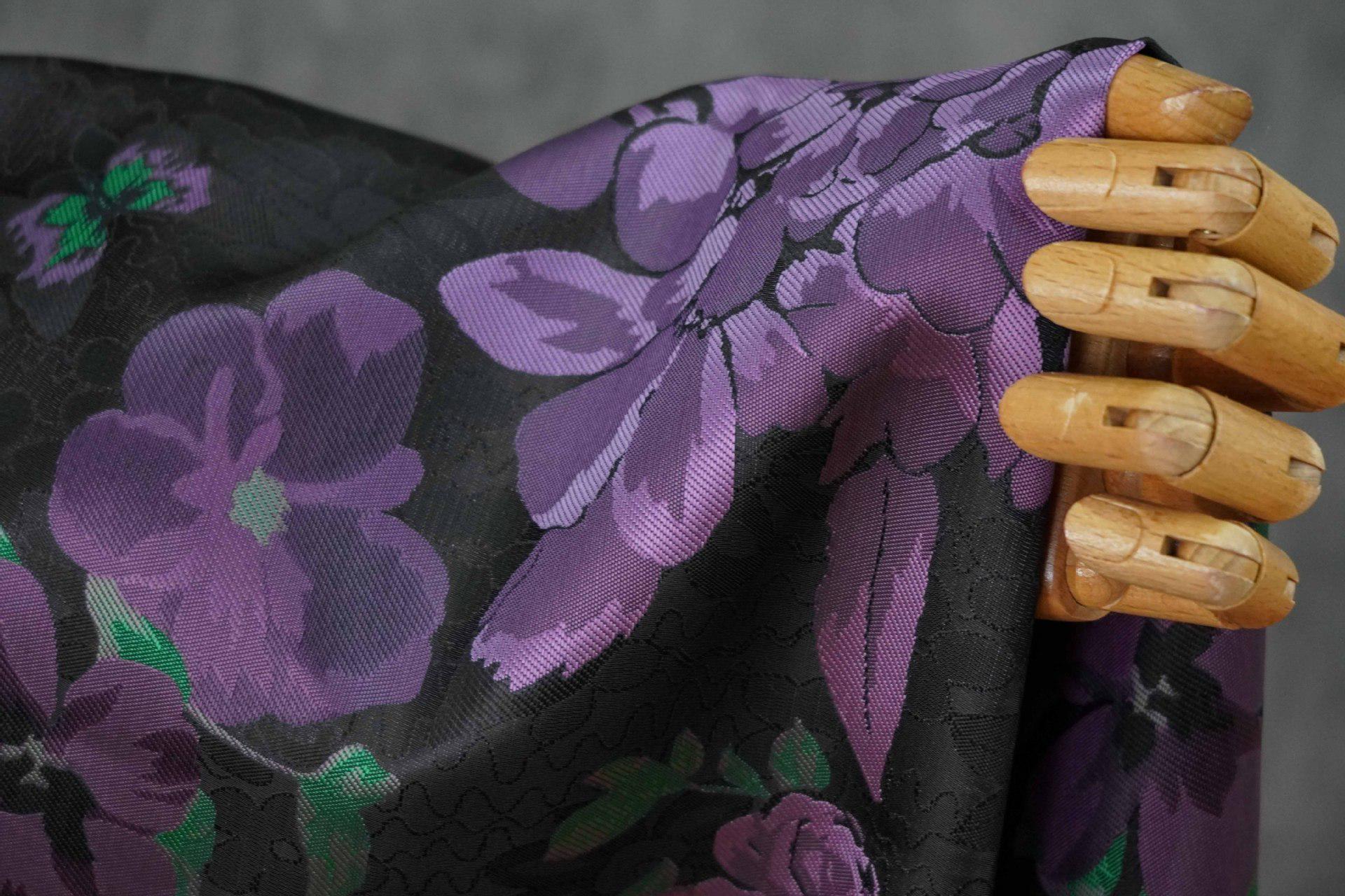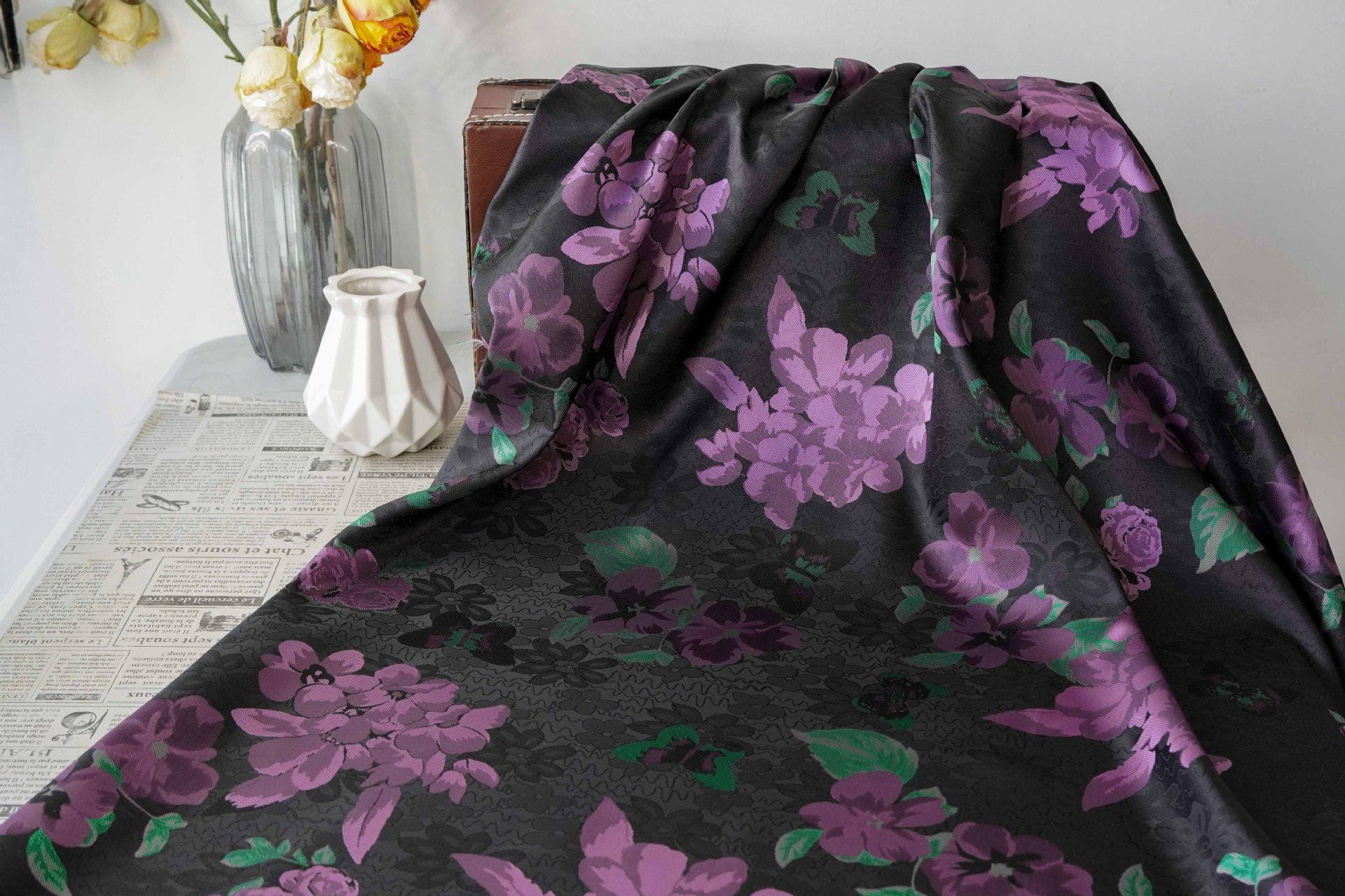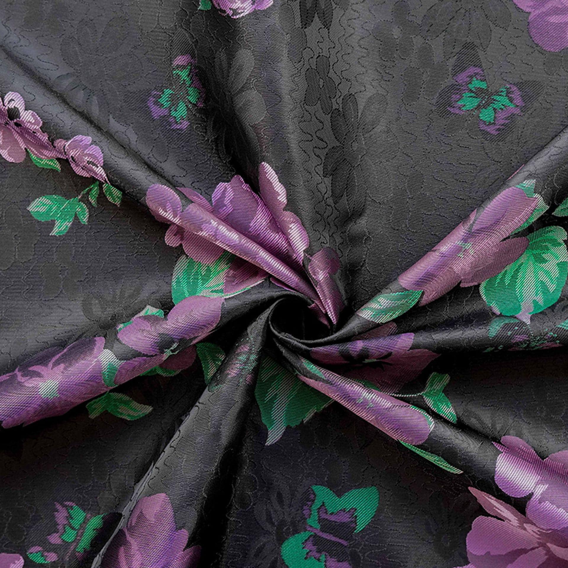 Black Jacquard Qipao Fabric with Purple Floral Pattern – Chinese Brocade Upholstery, Quilting, Cheongsam Sewing Fabric, 66"Wide