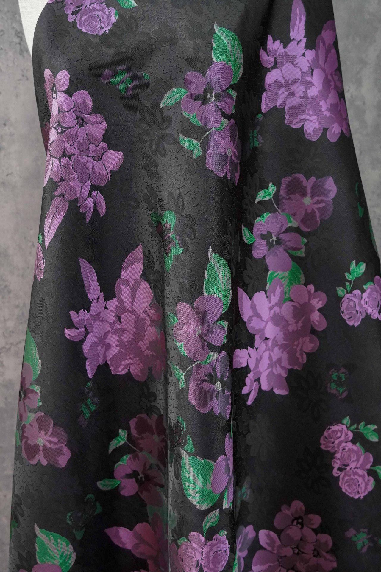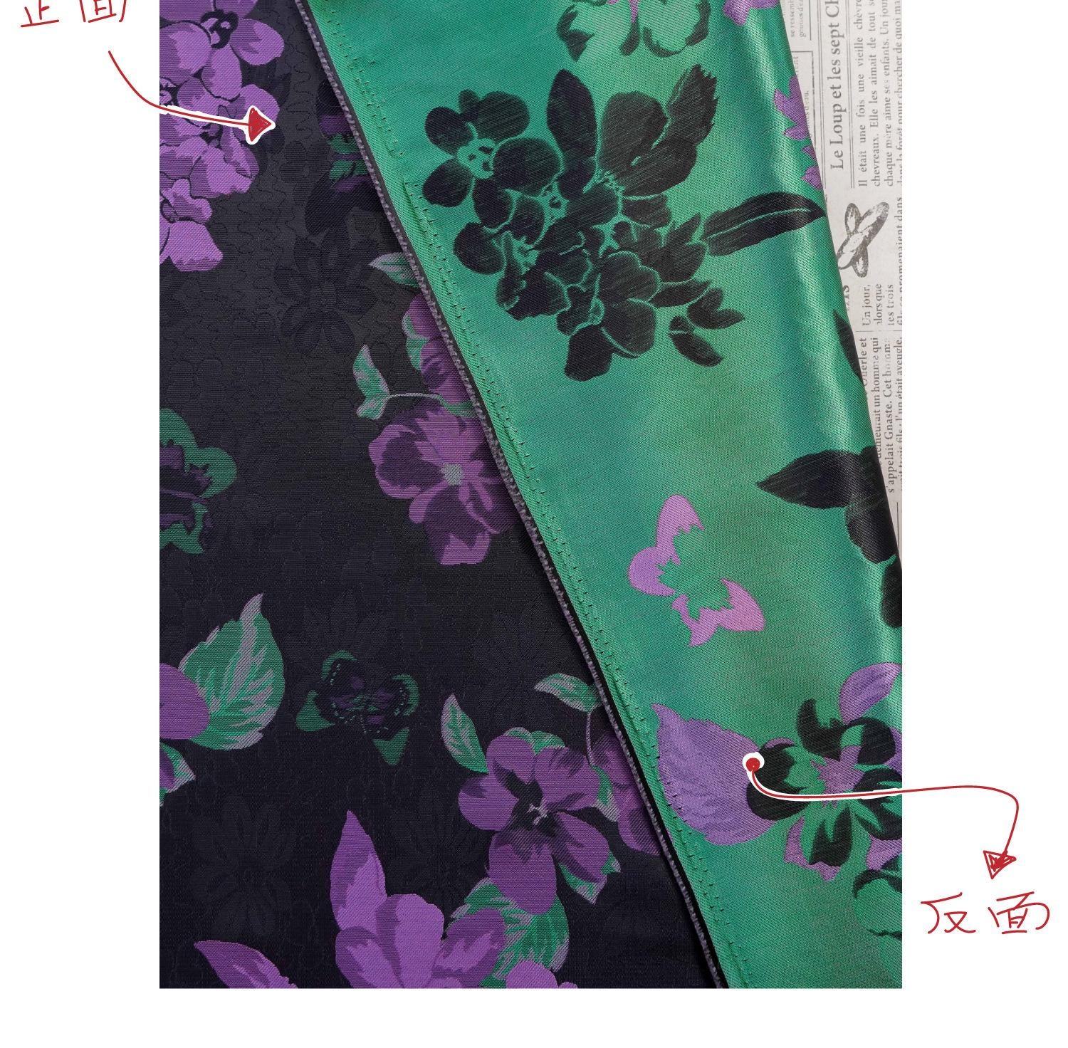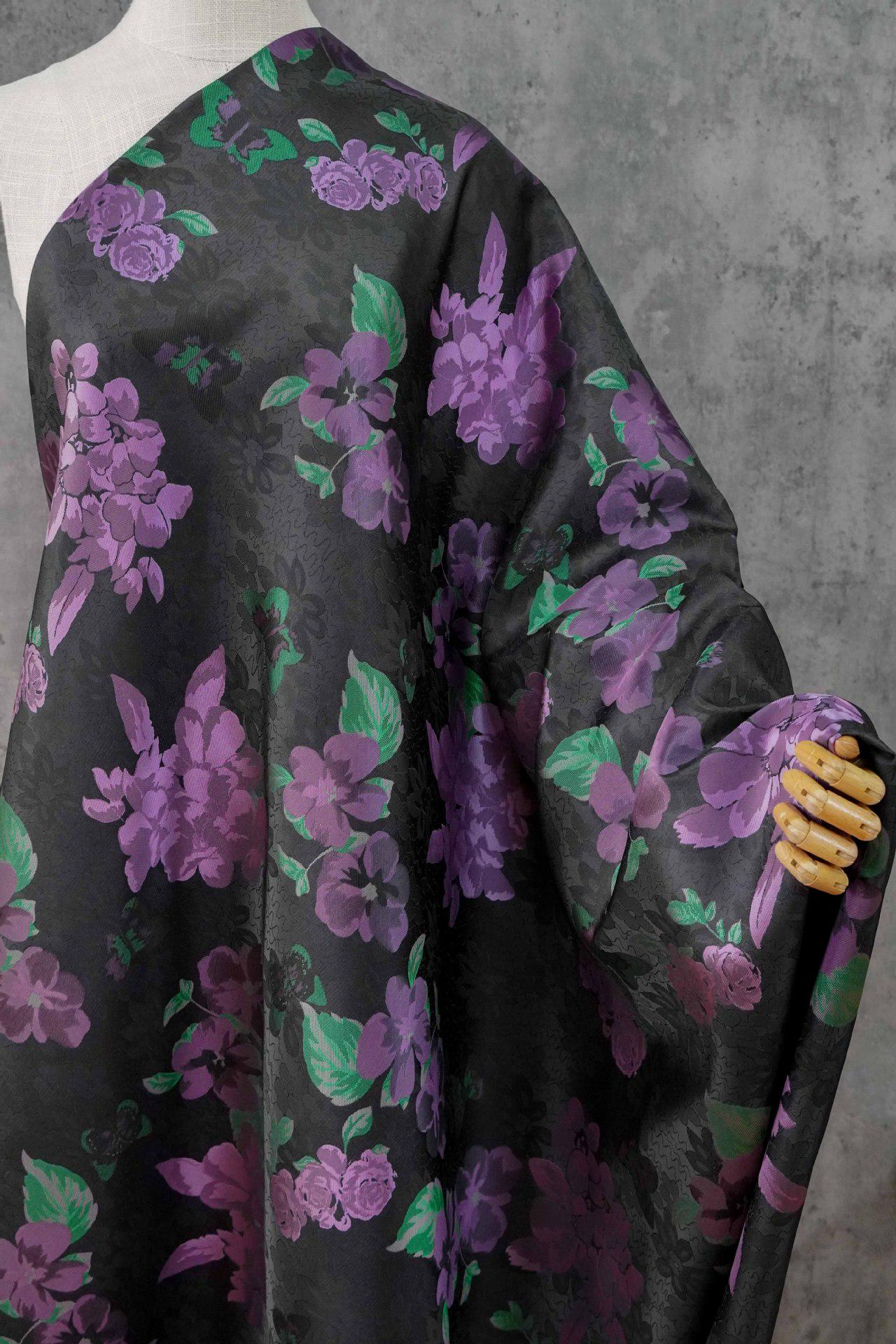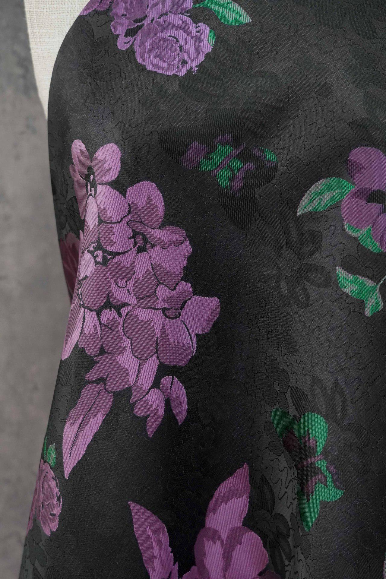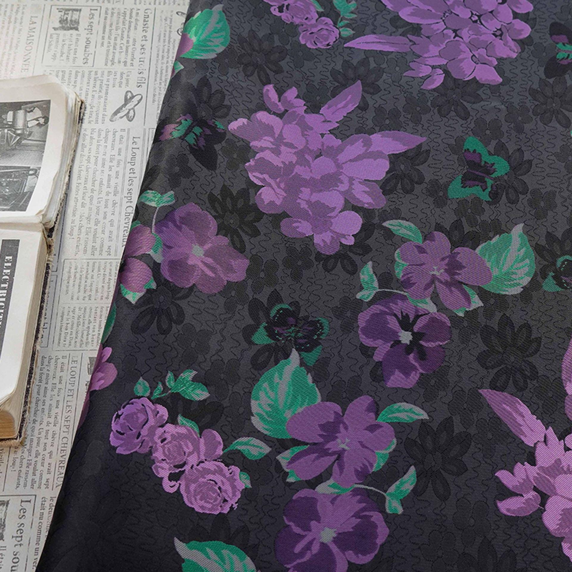 Black Jacquard Qipao Fabric with Purple Floral Pattern – Chinese Brocade Upholstery, Quilting, Cheongsam Sewing Fabric, 66"Wide