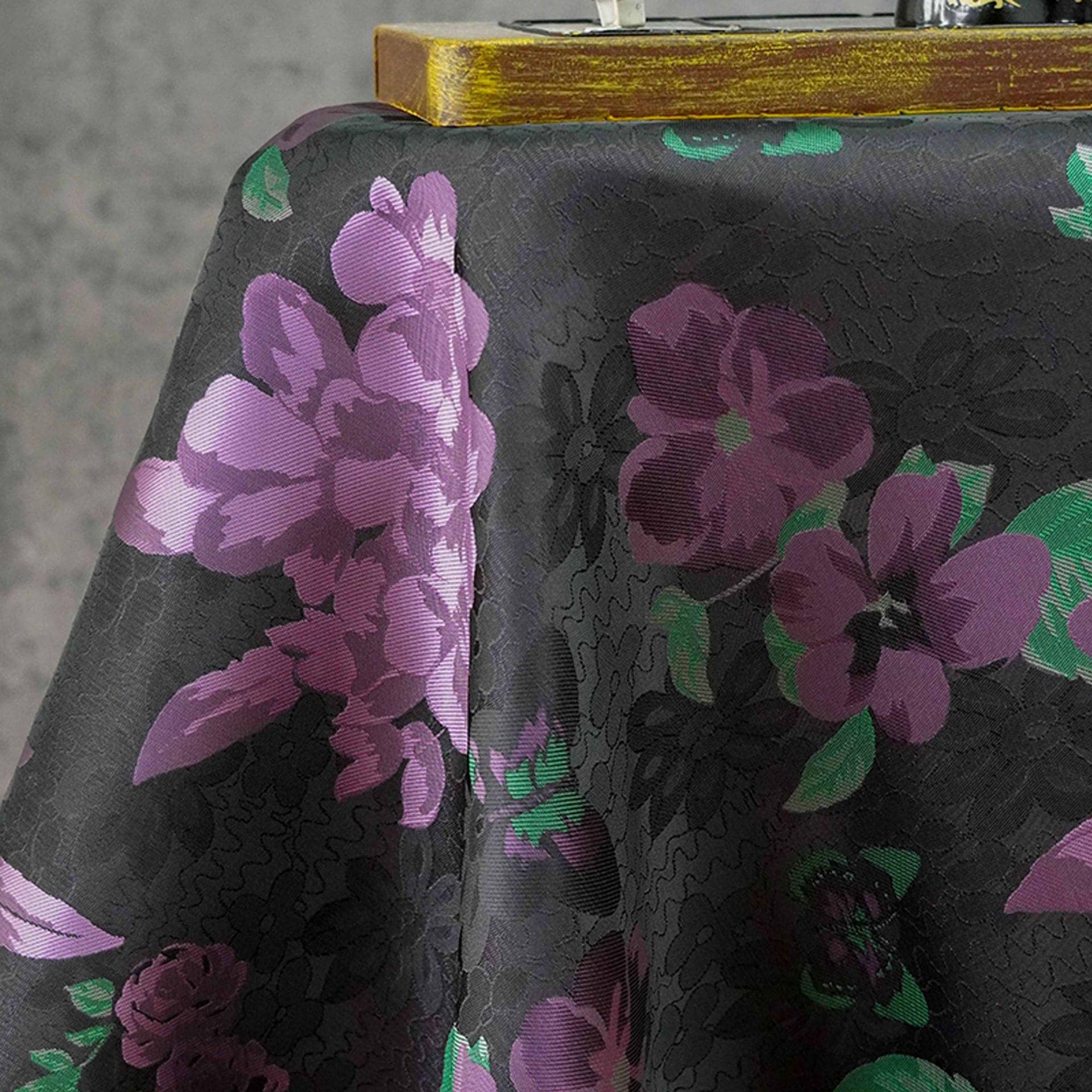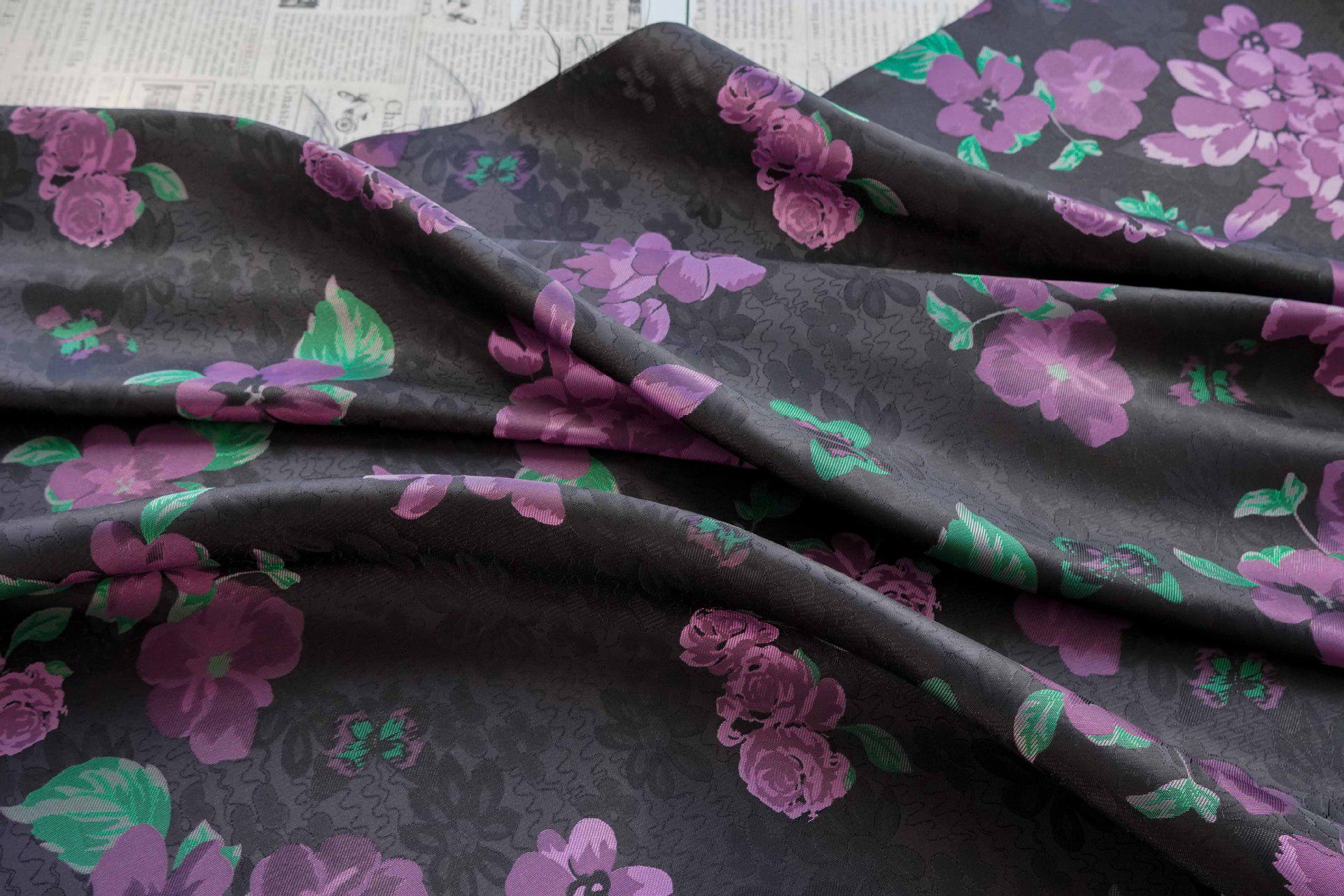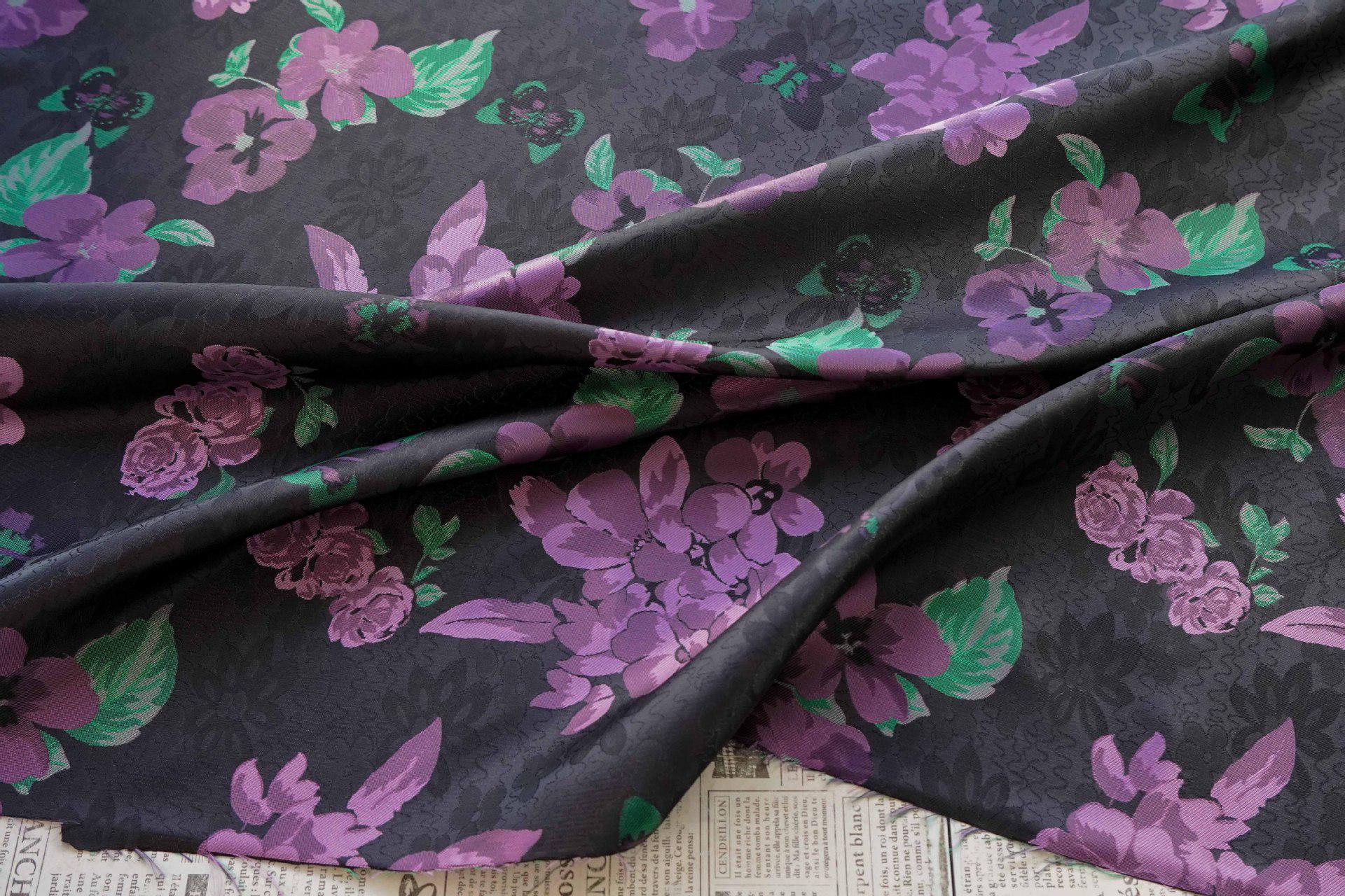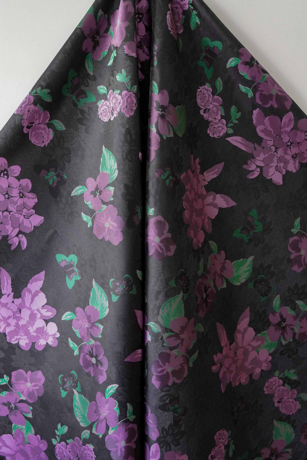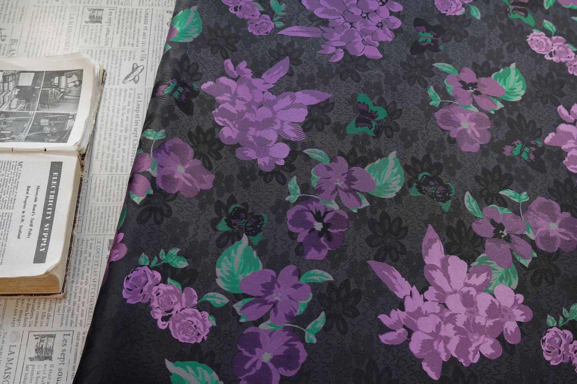 Black Jacquard Qipao Fabric with Purple Floral Pattern – Chinese Brocade Upholstery, Quilting, Cheongsam Sewing Fabric, 66"Wide